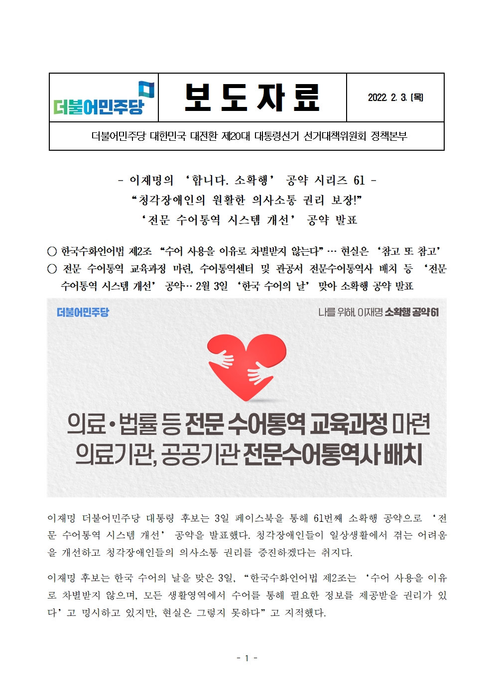 [보도자료] 더불어민주당 선대위 정책본부, '이재명은 합니다. 소확행 공약 시리즈 61' 전문 수어통역 시스템 개선 공약 발표