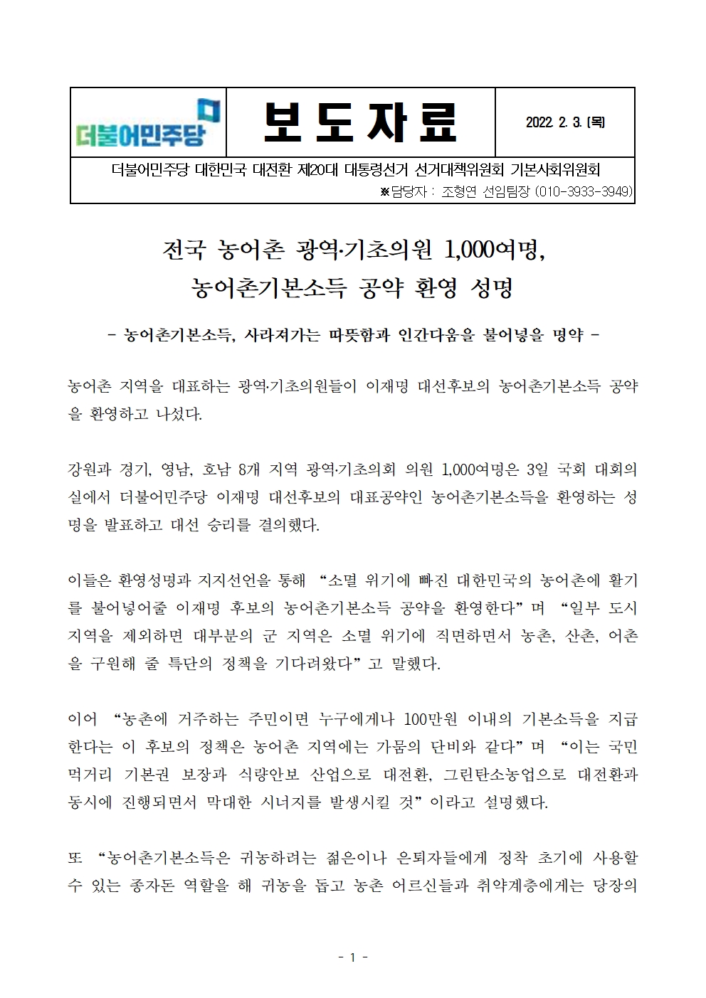 [보도자료] 더불어민주당 선대위 기본사회위원회, 전국 농어촌 광역·기초의원 1,000여 명 농어촌기본소득 공약 환영 성명