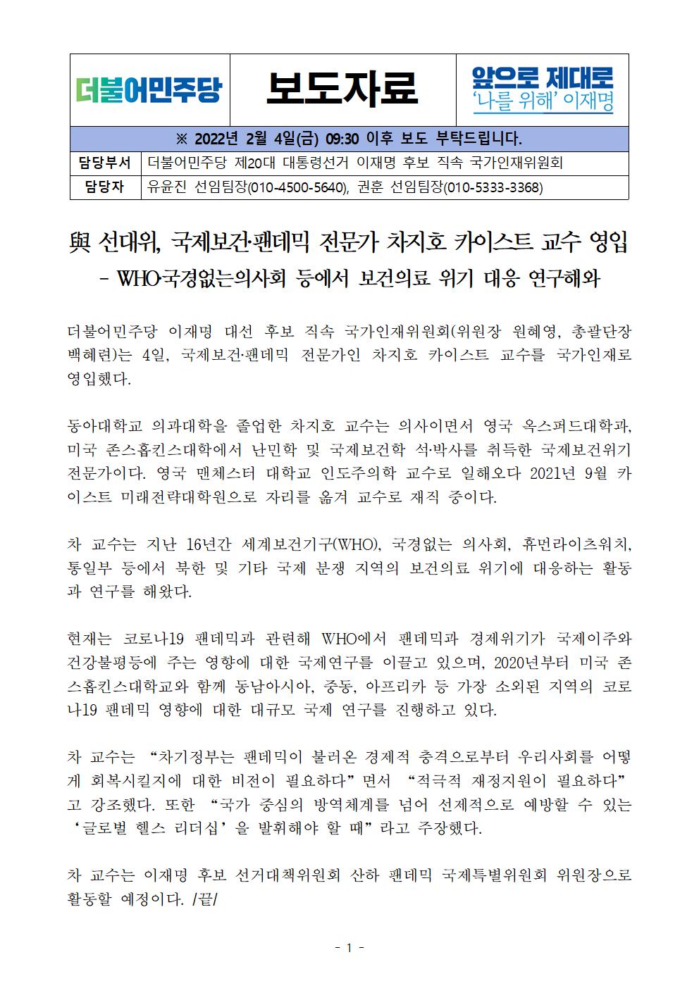 [보도자료] 더불어민주당 국가인재위원회 국제보건 팬데믹 전문가 영입
