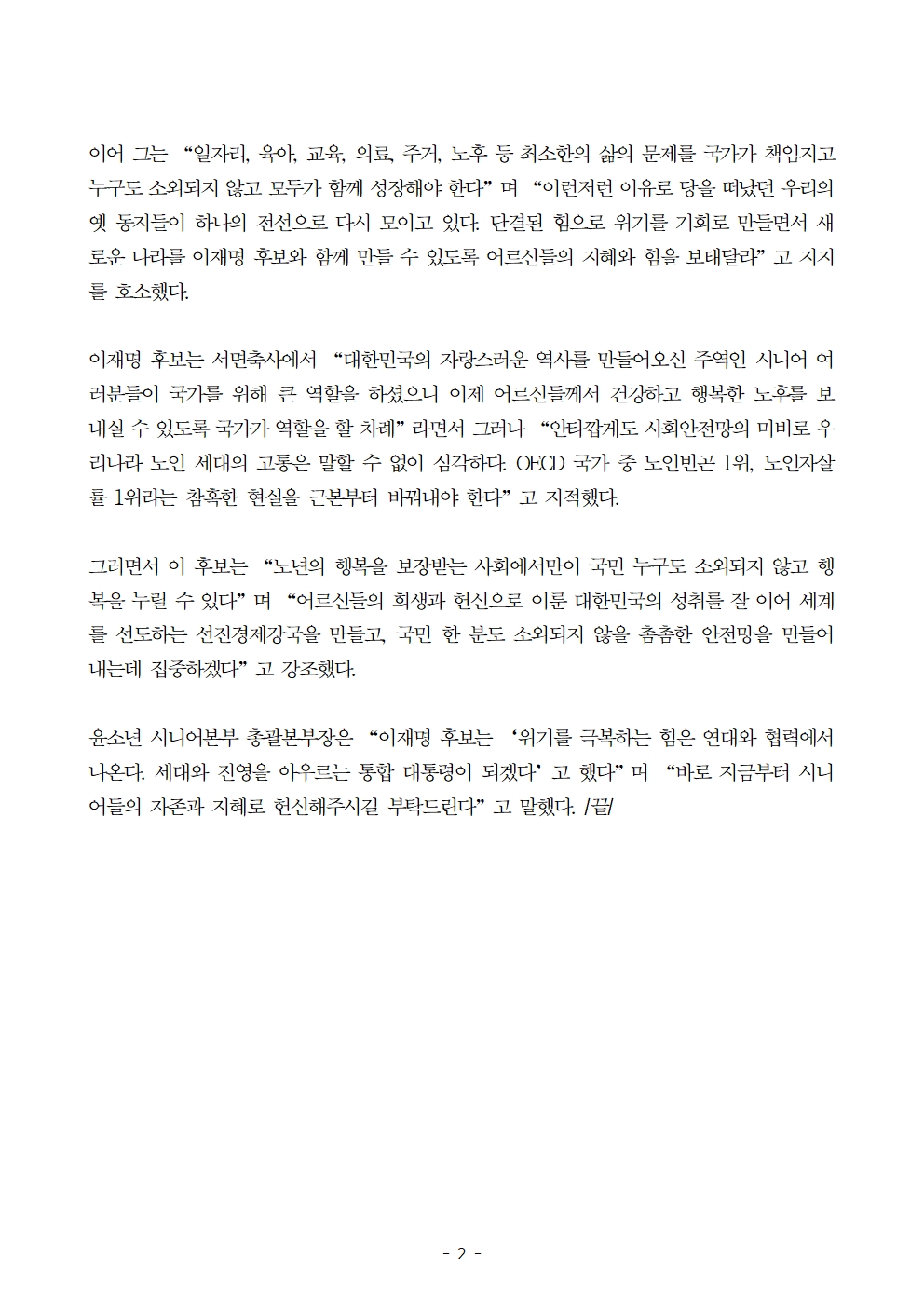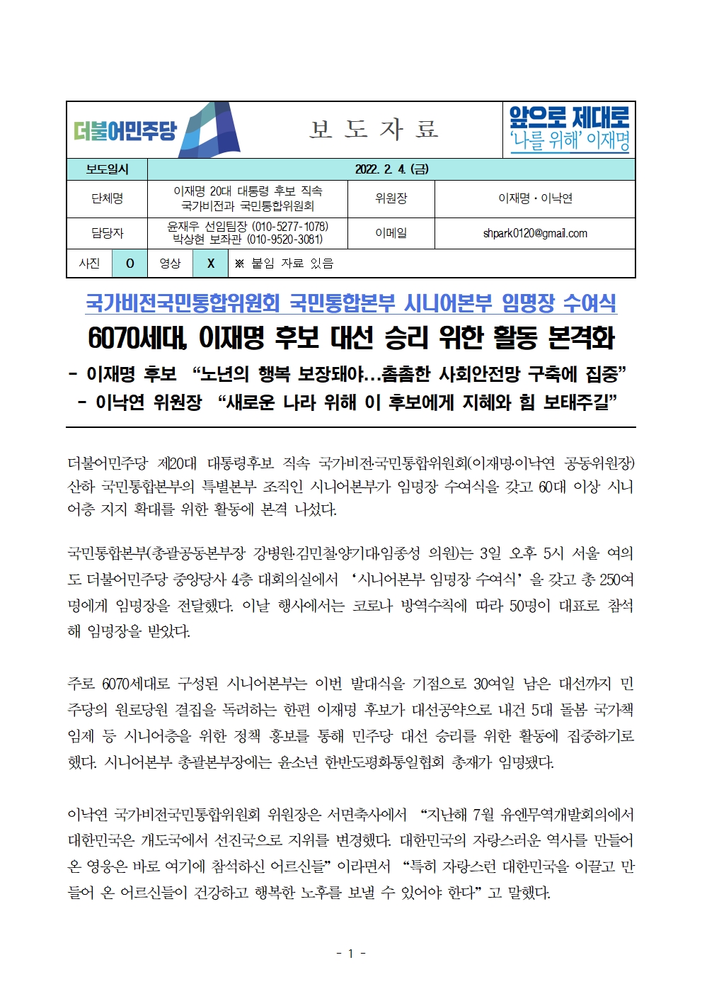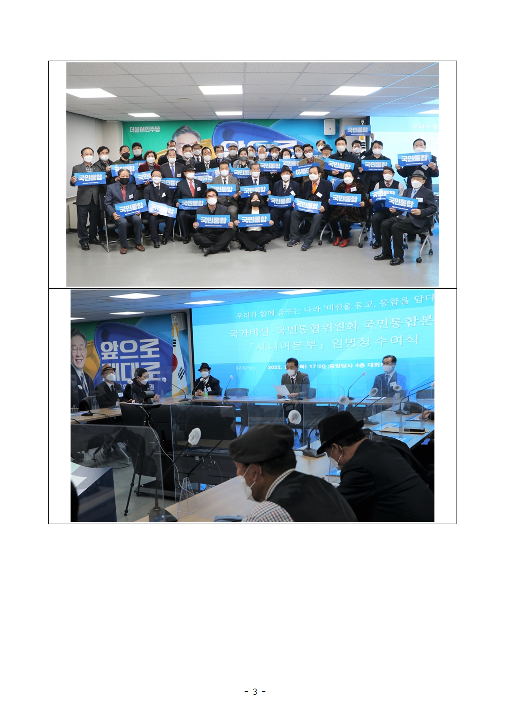 [보도자료] 더불어민주당 선대위 국가비전·국민통합위원회, 국민통합본부 시니어본부 임명장 수여식