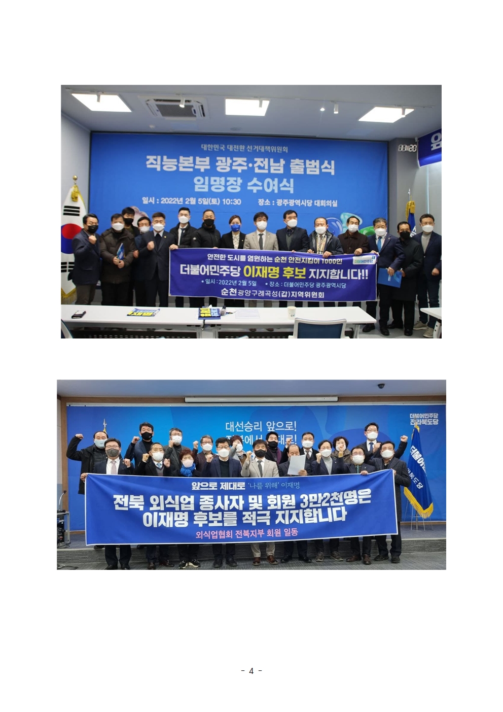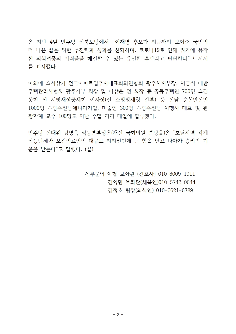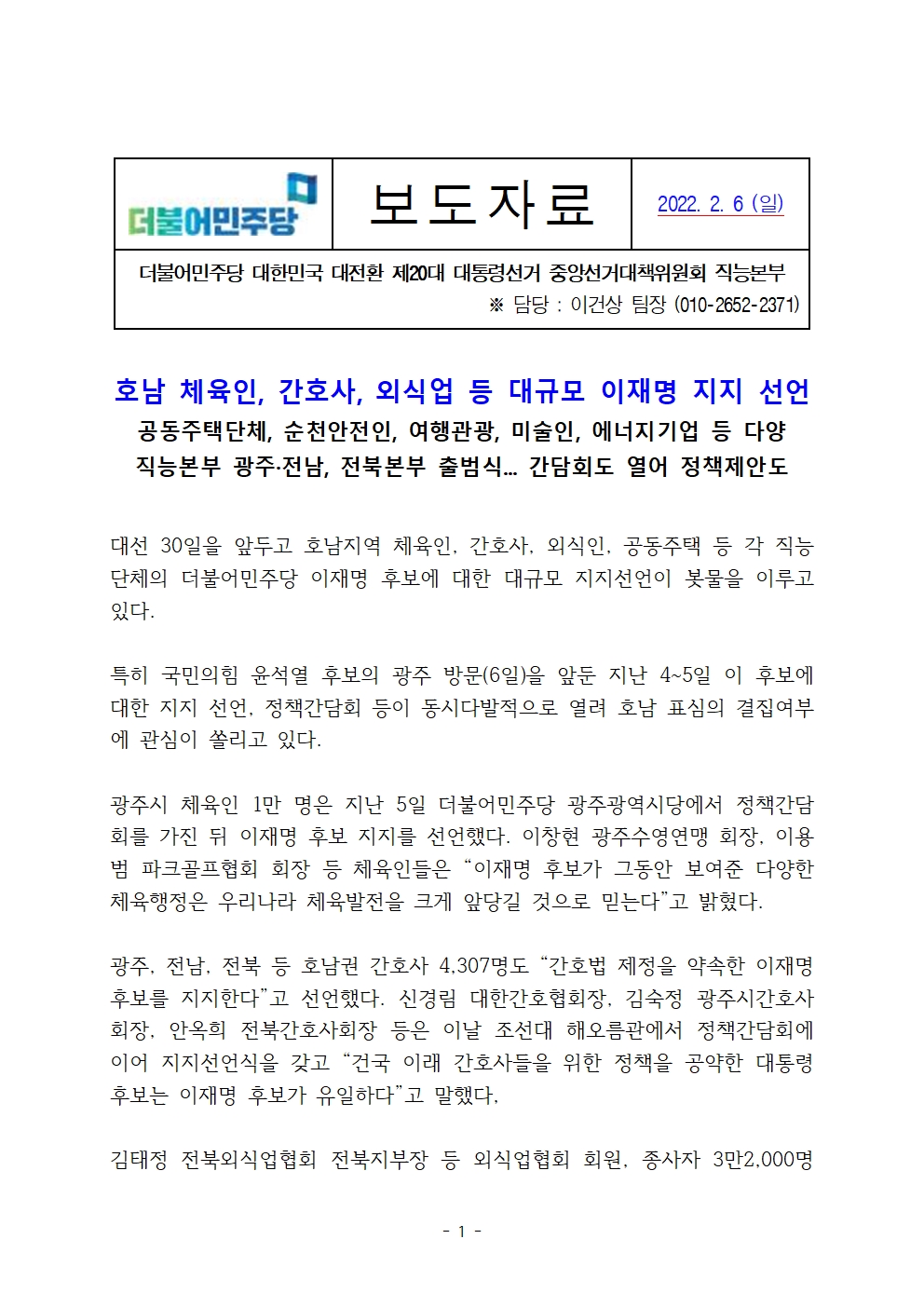 [보도자료] 더불어민주당 선대위 직능본부, 호남 체육인, 간호사, 외식업 등 대규모 지지 선언