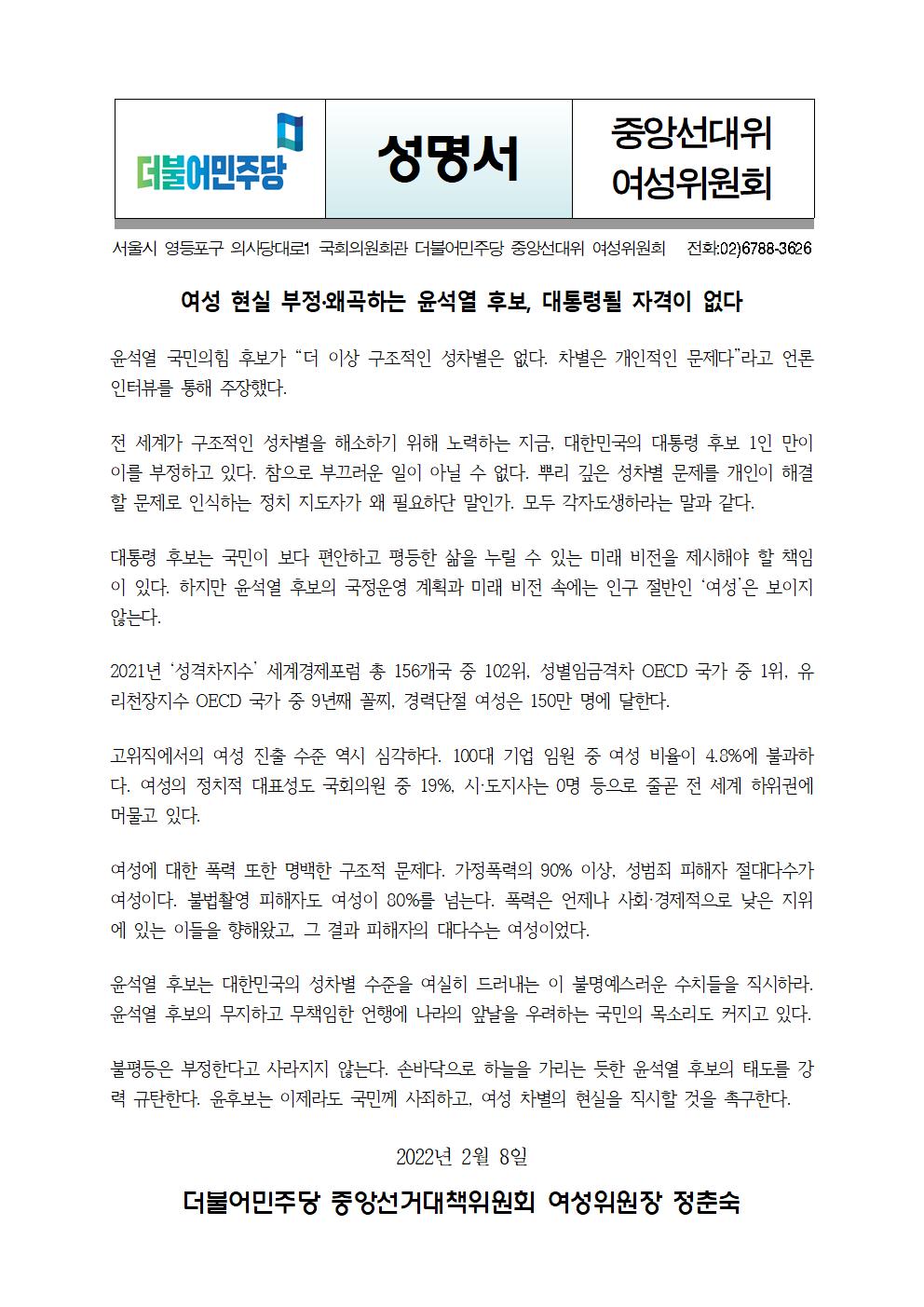 [성명서] 더불어민주당 선대위 여성위원회 여성 현실 부정 왜곡하는 윤석열 후보 대통령될 자격이 없다