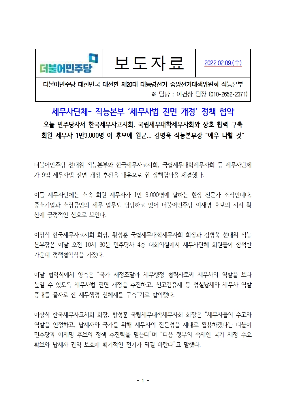 [보도자료] 더불어민주당 선대위 직능본부, 세무사단체-직능본부 '세무사법 전면 개정' 정책 협약