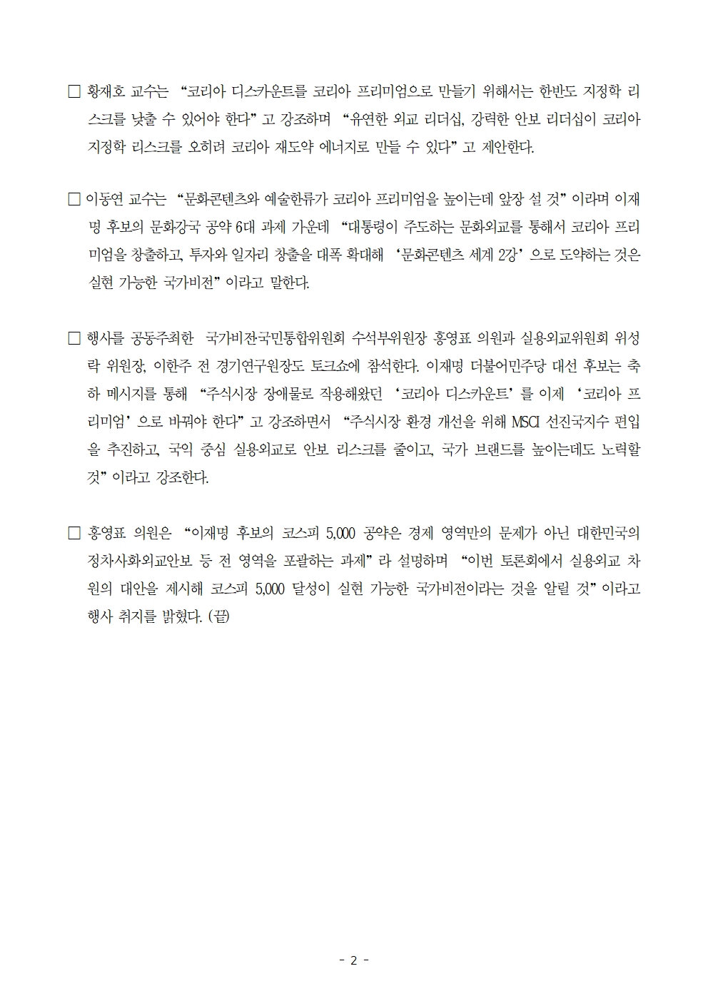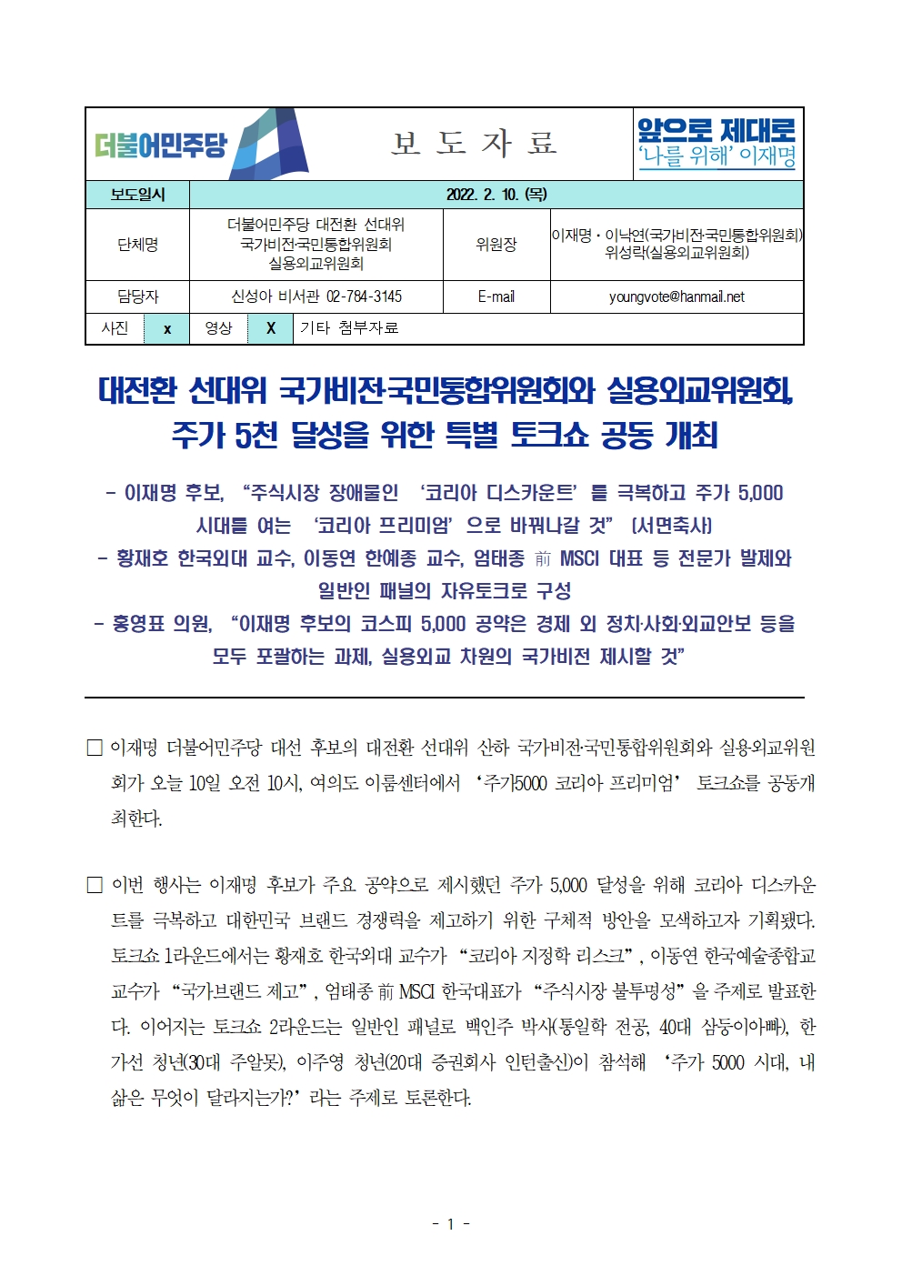 [보도자료] 더불어민주당 선대위 국가비전·국민통합위원회 · 실용외교위원회, 주가 5천 달성을 위한 특별 토크쇼 공동 개최