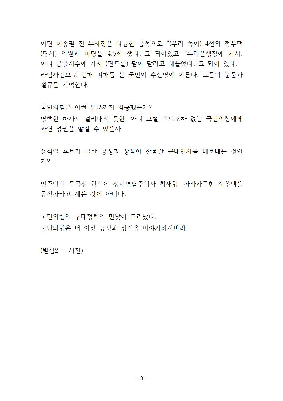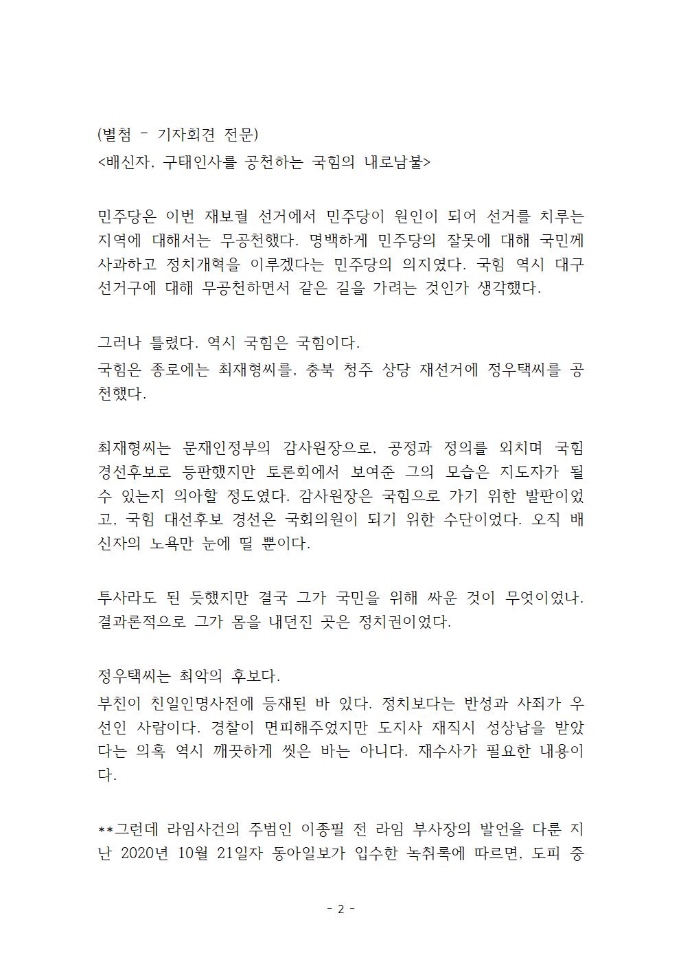 [보도자료] 더불어민주당 선거대위 조직본부 이원욱 조직본부장 국민의힘 재보궐 공천 문제 관련 기자회견