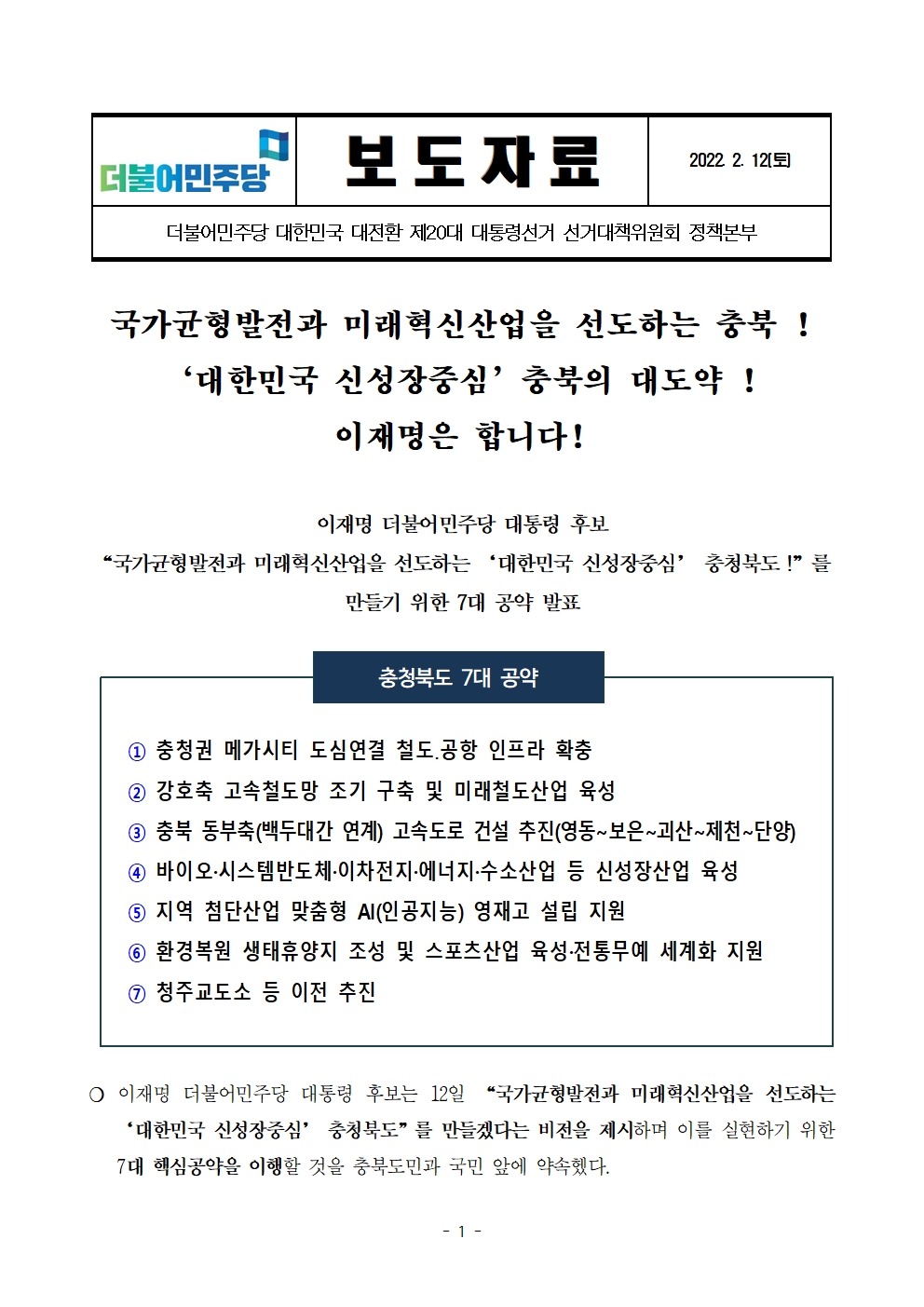 [보도자료] 더불어민주당 선대위 정책본부, 충북 7대 공약 발표