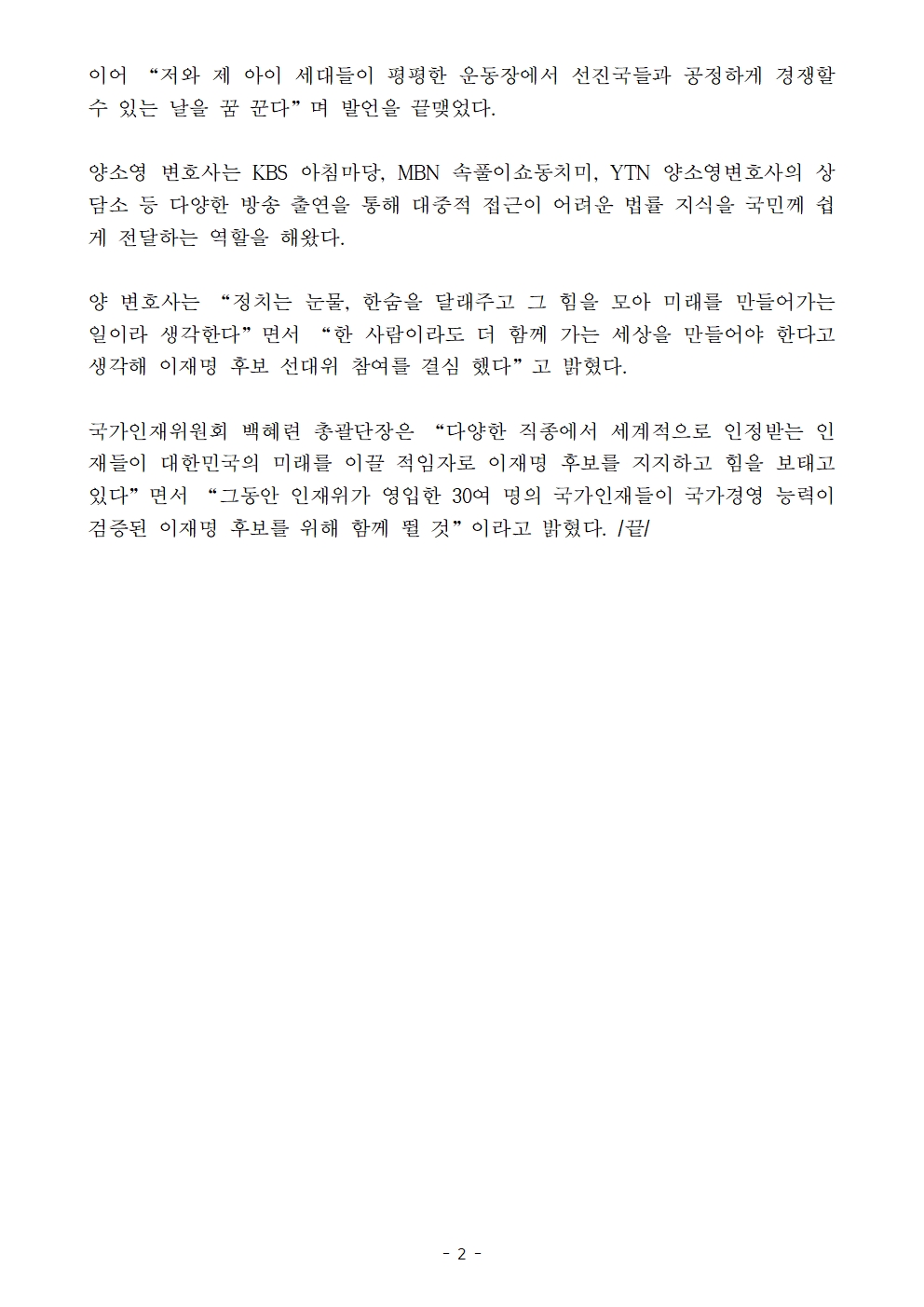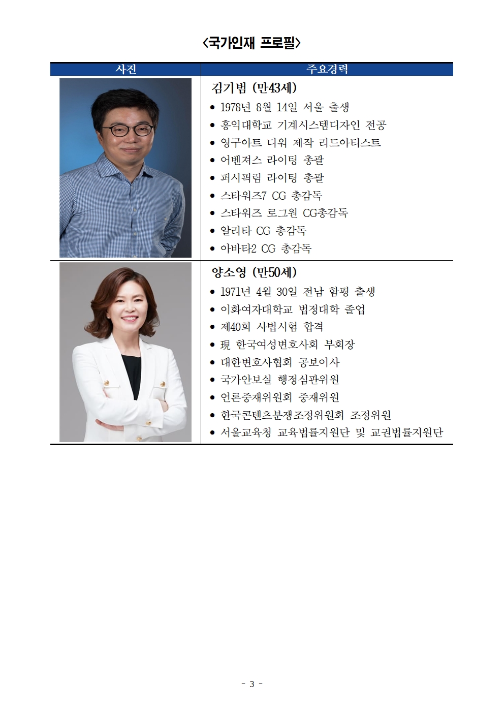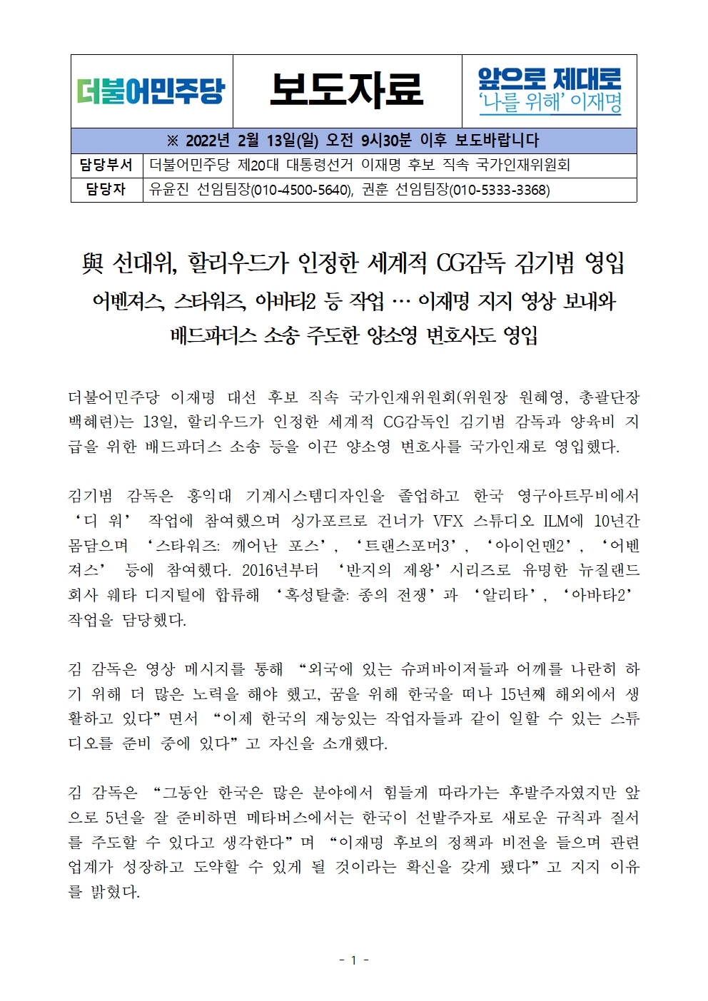 [보도자료]더불어민주당 국가인재위원회, 세계적 CG감독 김기범 감독, 배드파더스 소송 주도 양소영 변호사 영입