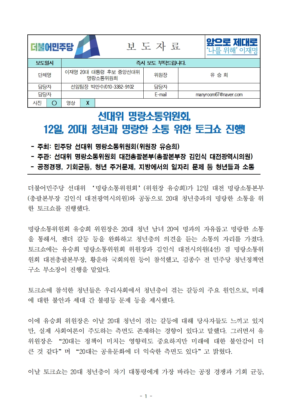 [보도자료] 더불어민주당 선대위 명랑소통위원회, 20대 청년과 명랑한 소통 위한 토크쇼 진행