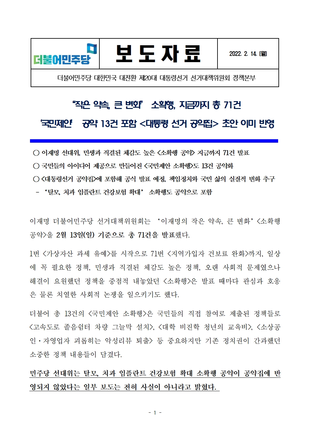 [보도자료] 더불어민주당 선대위 정책본부, 이재명의 작은 약속, 큰 변화’ 71건 발표, 초안 이미 반영