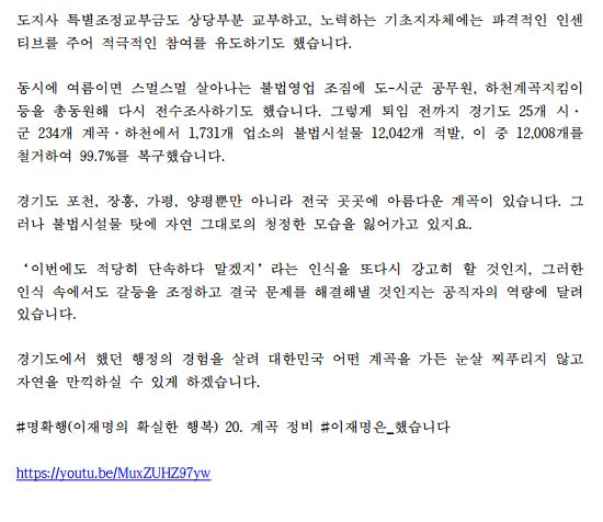 [보도자료] 더불어민주당 선대위 현안대응TF, 이재명 후보 '명확행' 스무 번째 시리즈 '계곡 불법시설물 정비' 성과 소개