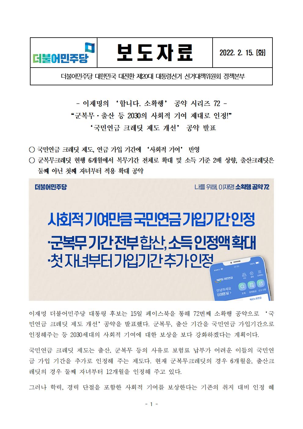[보도자료] 더불어민주당 선대위 정책본부, '이재명은 합니다. 소확행 공약 시리즈 72' 국민연금 크레딧 제도 개선 공약 발표