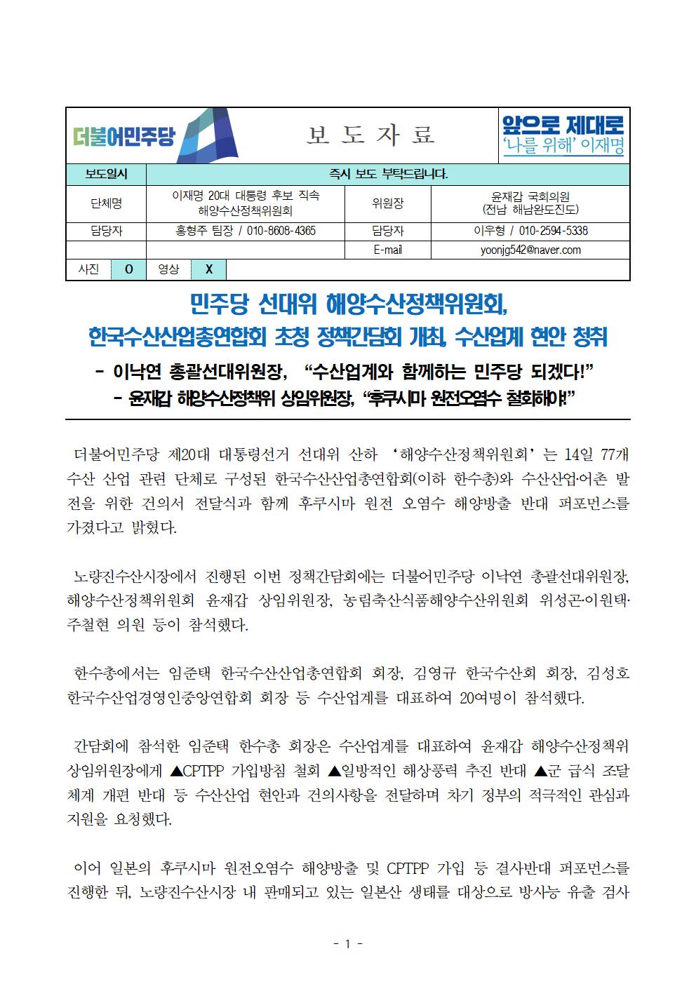 [보도자료] 더불어민주당 선대위 해양수산정책위원회 한국수산업총연합회 초청 정책간담회 개최