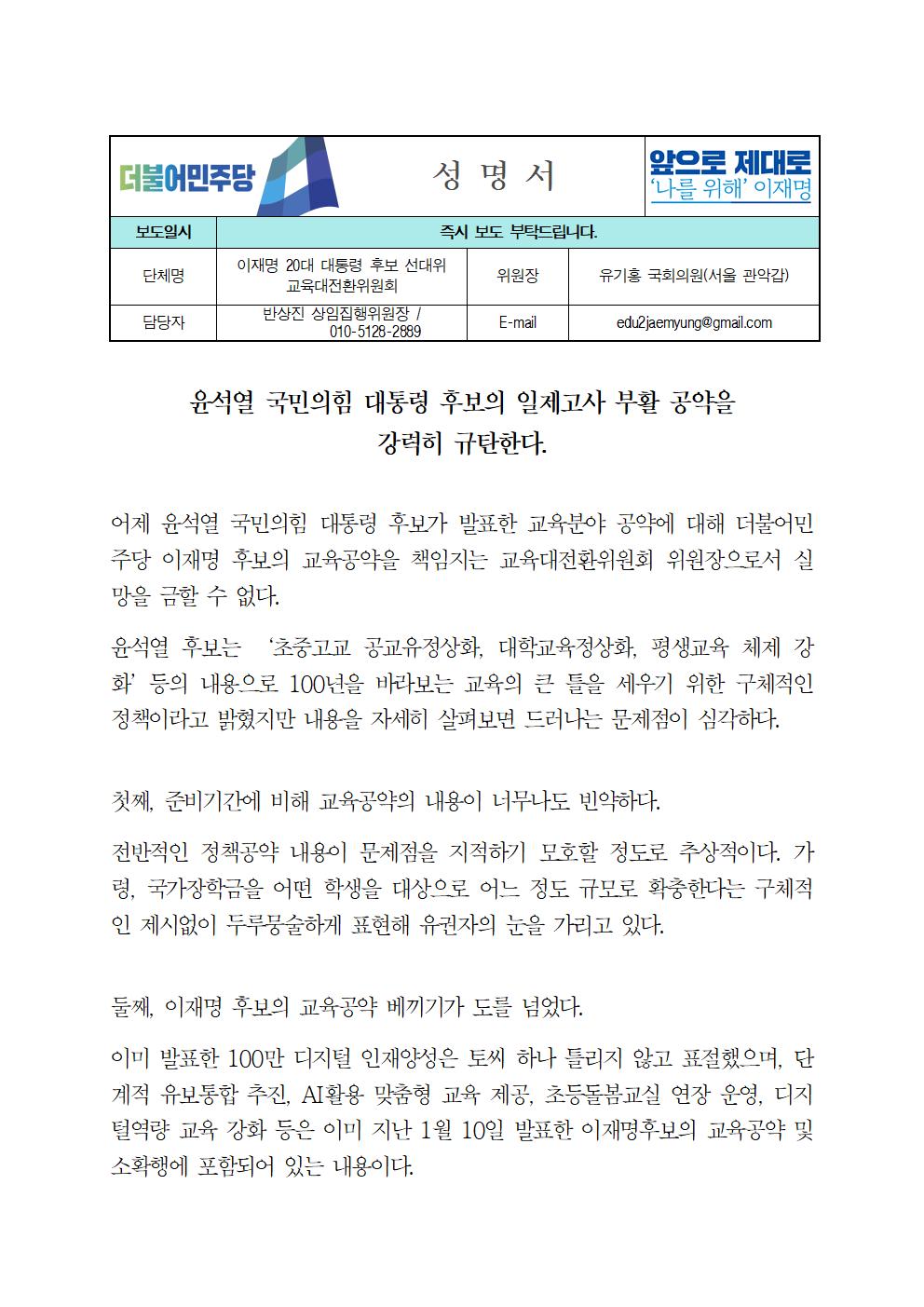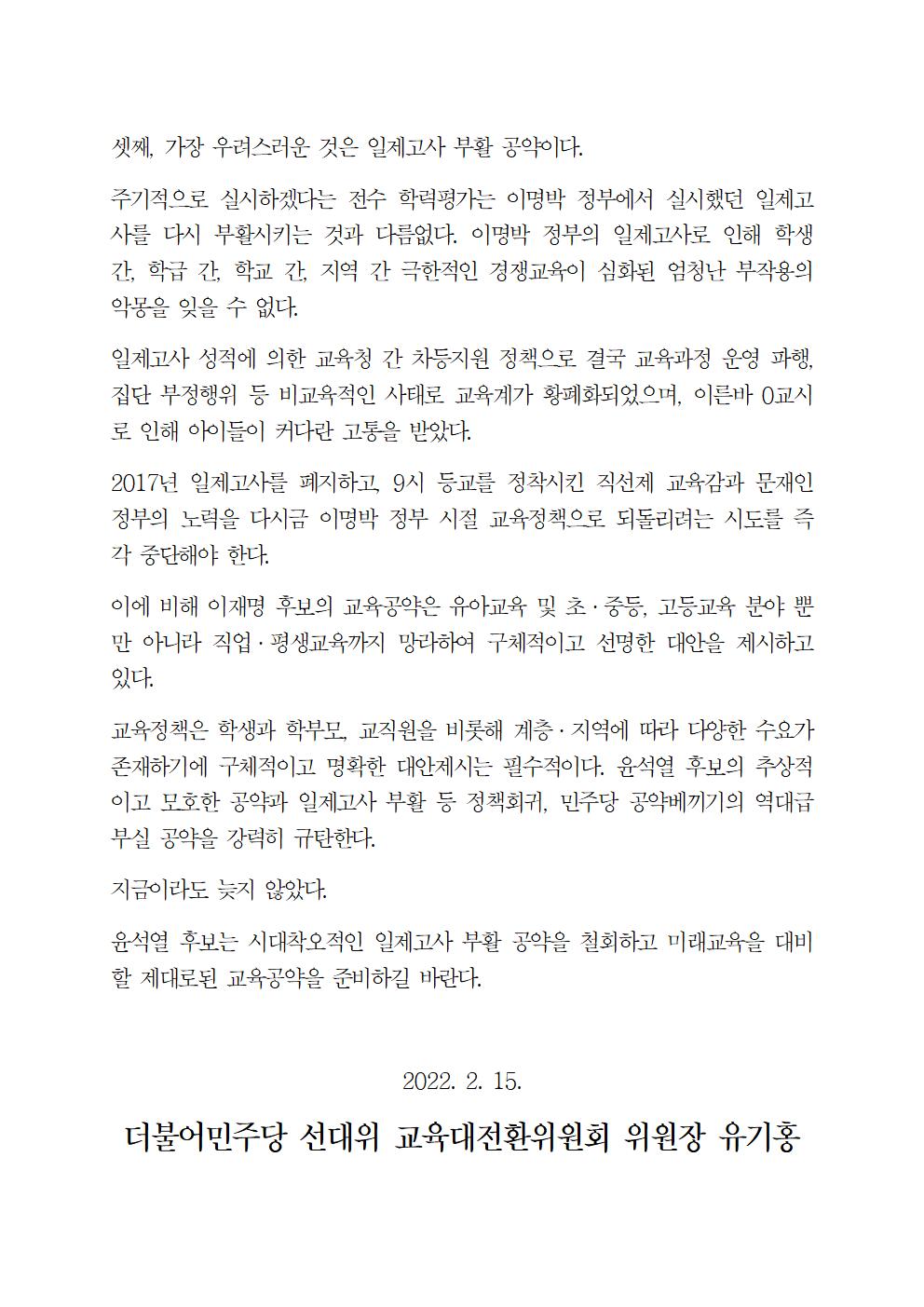 [성명서] 더불어민주당 선대위 교육대전환위원회 윤석열 국민의힘 대통령 후보 일제고사 부활 공약을 강력 규탄한다