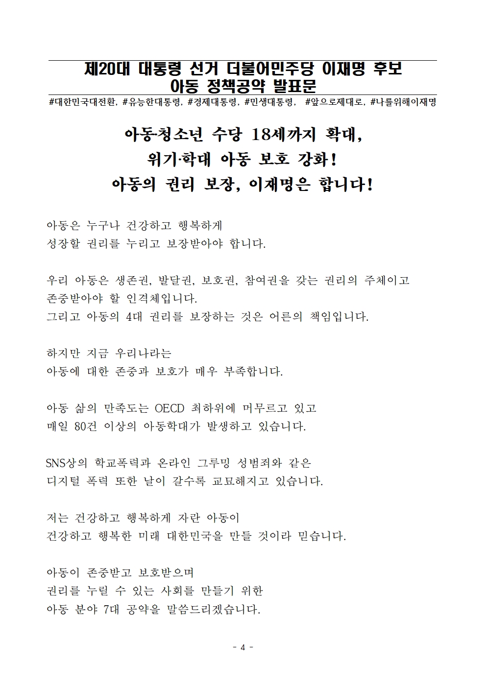 [보도자료] 더불어민주당 선대위 정책본부·포용복지국가위원회, 아동 정책 공약 종합발표