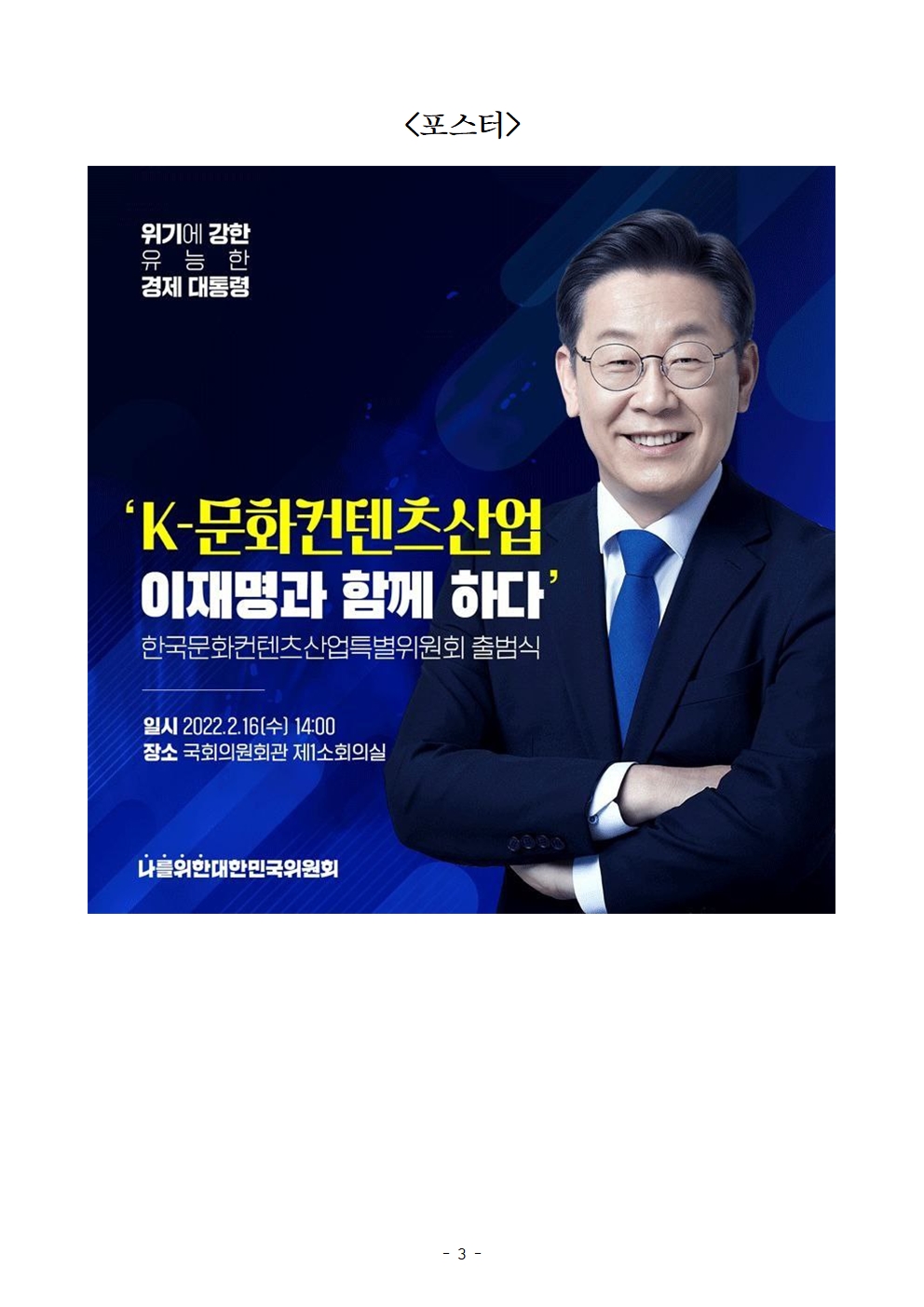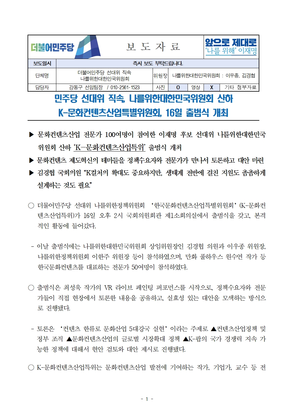 [보도자료] 더불어민주당 선대위 나를위한대한민국위원회, K-문화컨텐츠산업특별위원회 출범식 개최