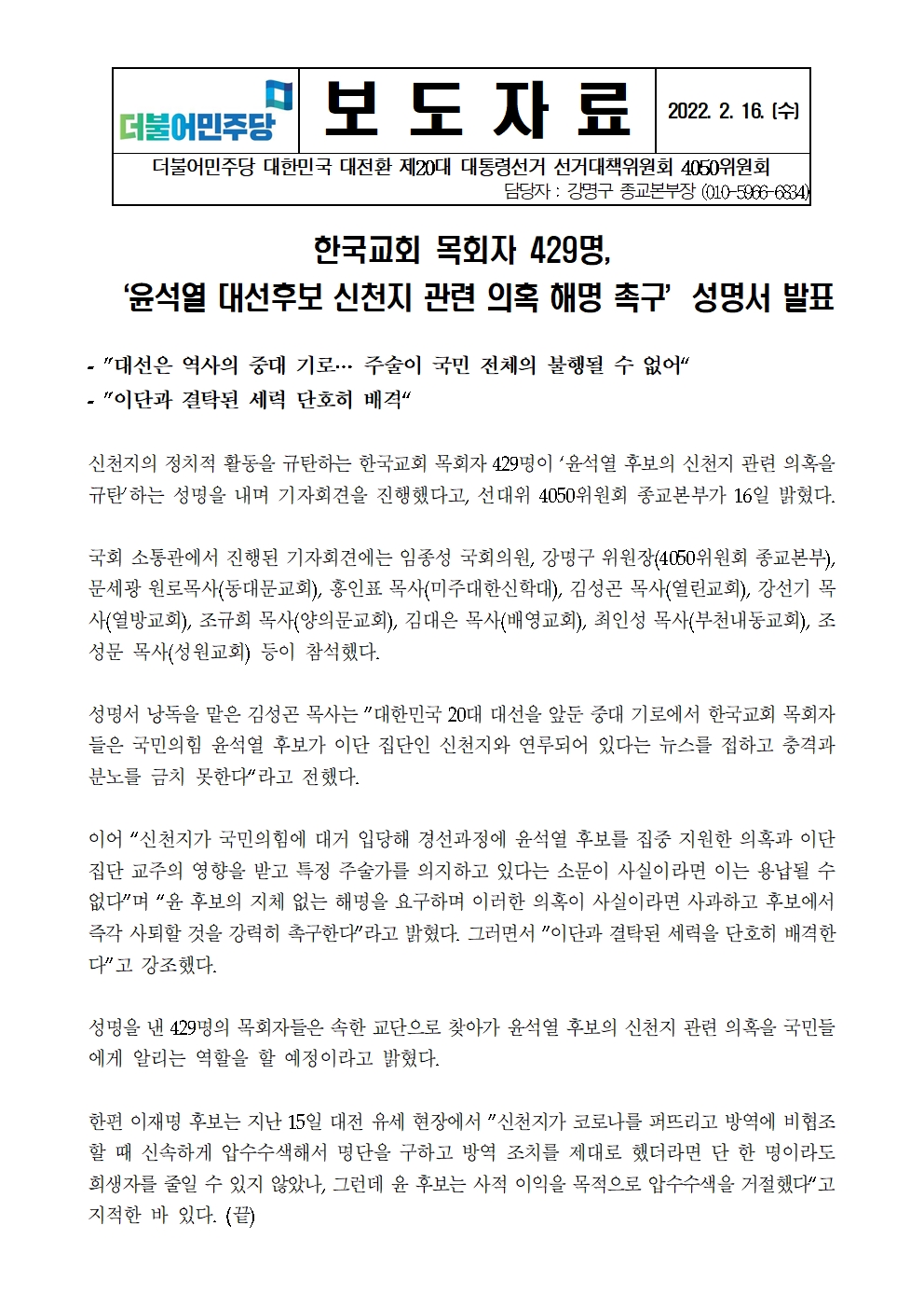 [보도자료] 더불어민주당 선대위 4050위원회, 한국교회 목회자 429명 '윤석열 대선후보 신천지 관련 의혹 해명 촉구' 성명서 발표