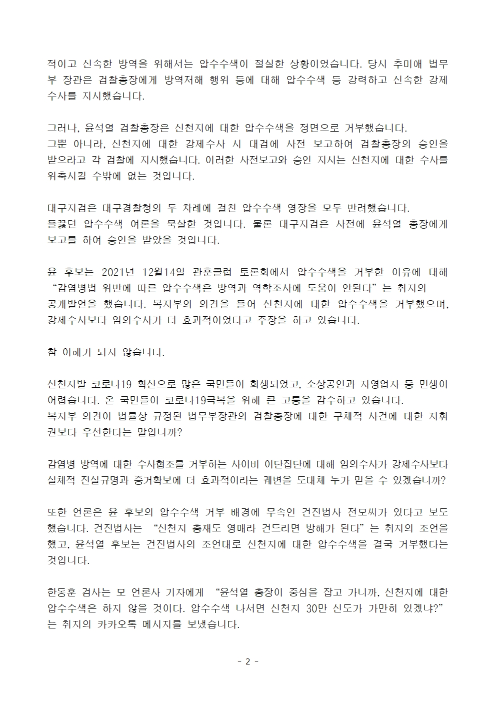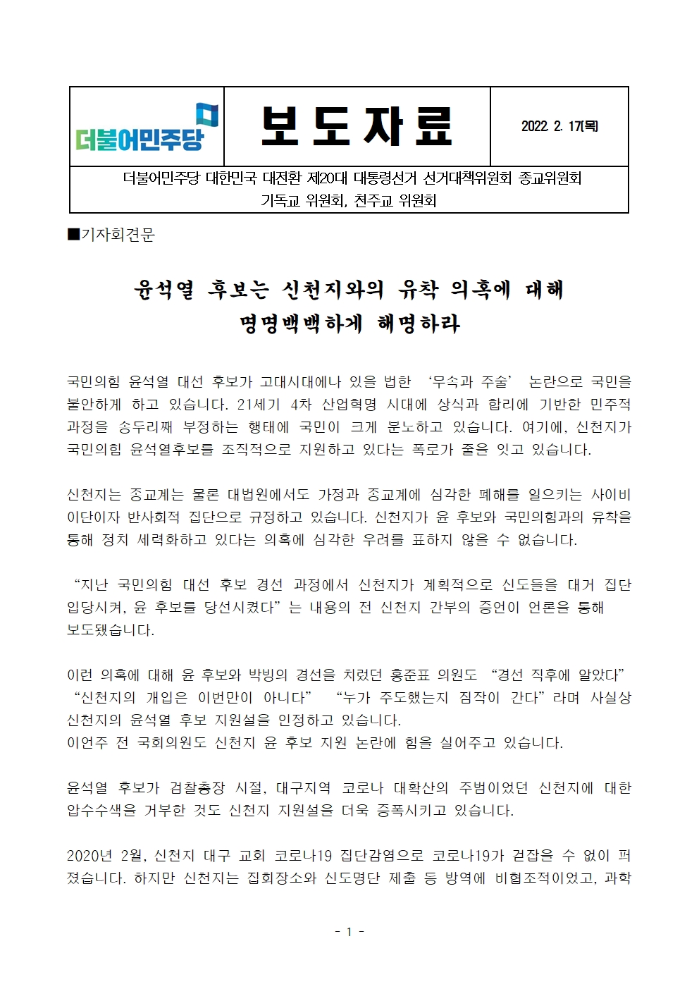 [보도자료] 더불어민주당 선대위 종교위원회, '윤석열 후보는 신천지와의 유착 의혹에 대해 명명백백하게 해명하라' 기자회견문