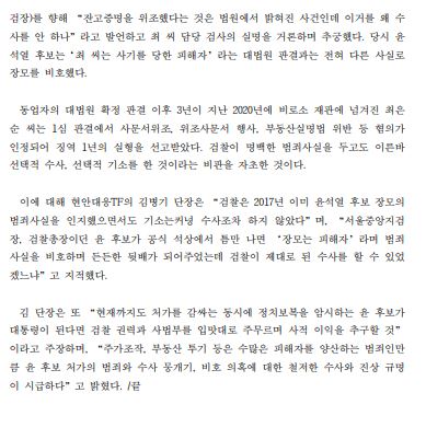 [보도자료] (더불어민주당 선대위 현안대응TF) 윤석열 장모 최 씨 범죄행각, 검찰 알면서 3년간 기소조차 안해. 국민의힘 장제원 의원도 지적, 윤석열은 '처가 비호' 밝혀야