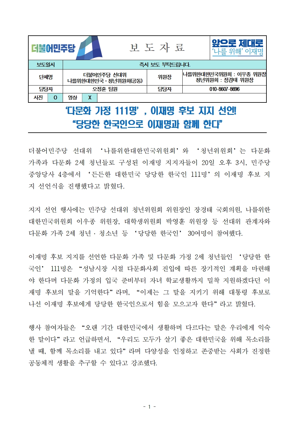 [보도자료] 더불어민주당 선대위 나를위한대한민국위원회·청년위원회, 다문화 가정 111명 후보 지지선언