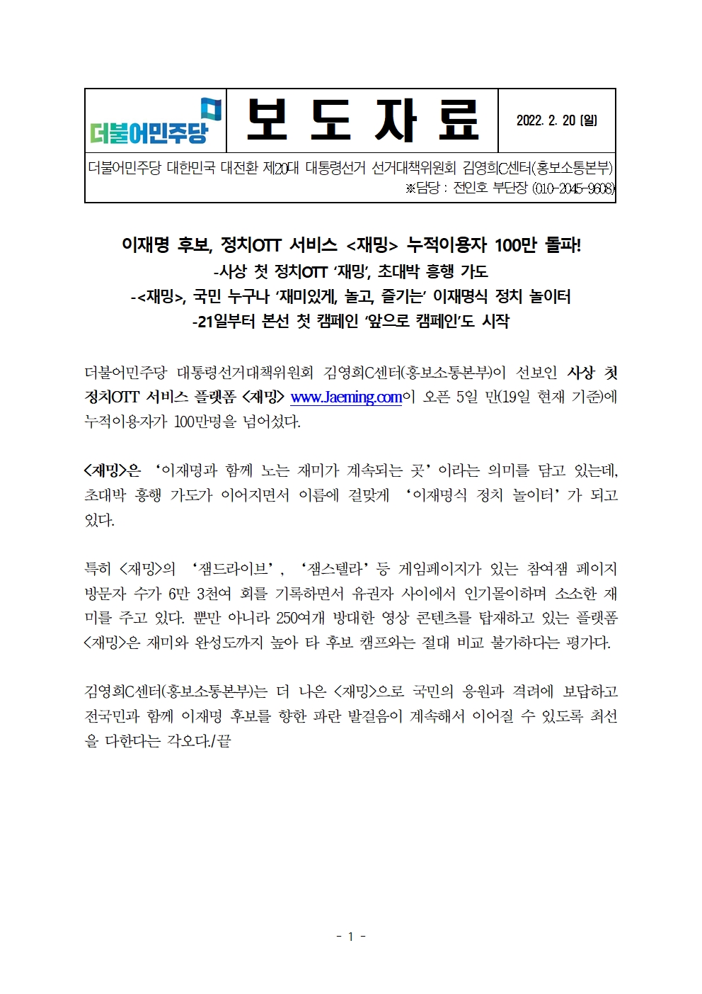 [보도자료] 더불어민주당 선대위 김영희C센터, 이재명 후보 정치OTT 서비스 '재밍' 누적이용자 100만 돌파