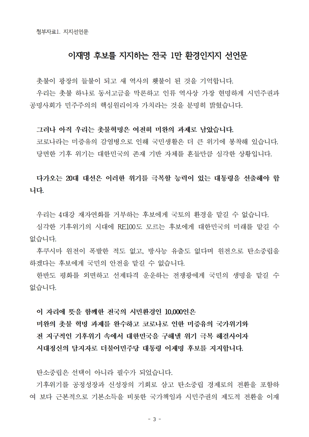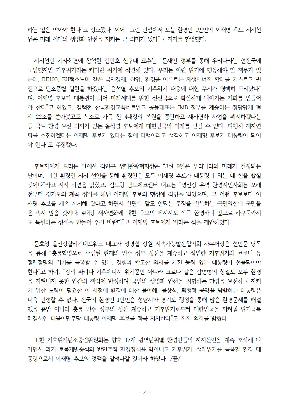 [보도자료] 더불어민주당 선대위 기후위기탄소중립위원회, 전국 환경인 1만 명, 후보 지지선언