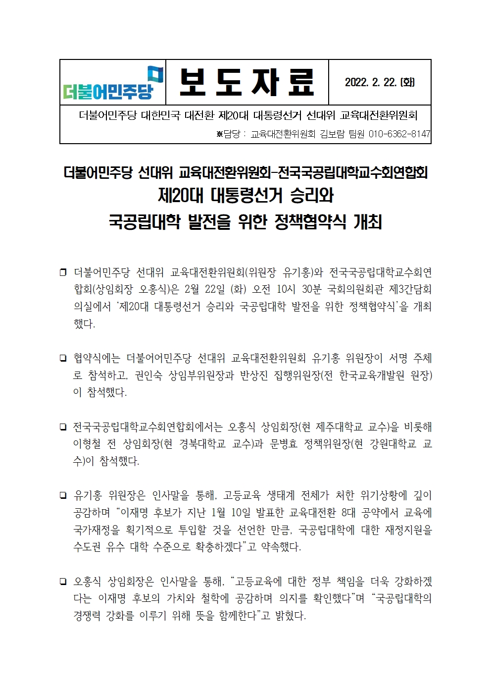 [보도자료] 더불어민주당 선대위 교육대전환위원회·전국국공립대학교수회연합회, 국공립대학 발전을 위한 정책협약식 개최