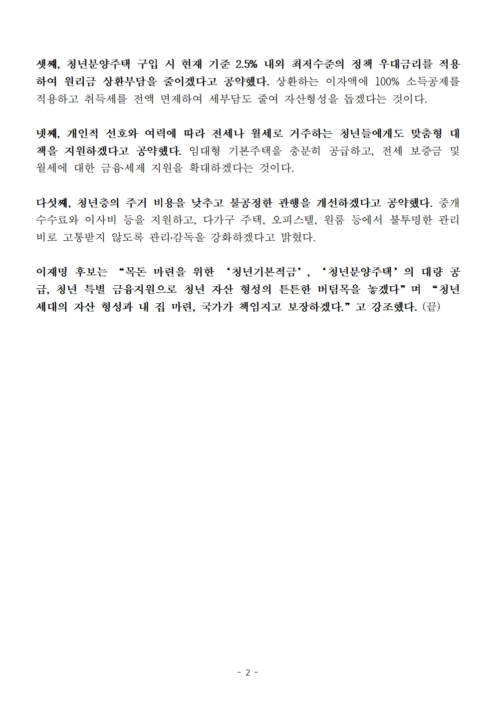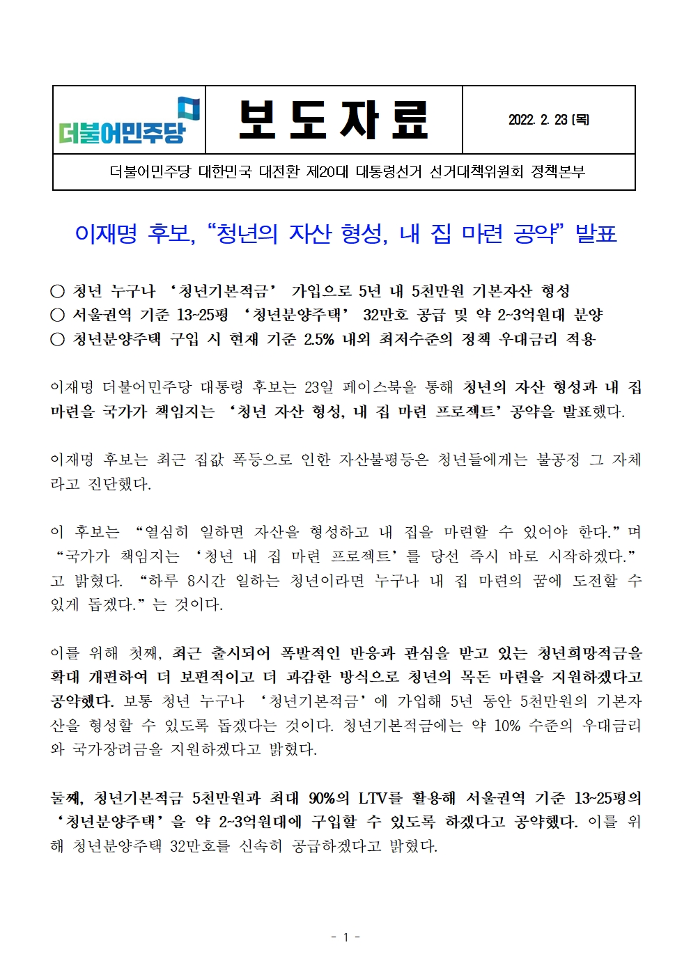 [보도자료] 더불어민주당 선대위 정책본부, 이재명 후보 '청년의 자산 형성, 내 집 마련 공약' 발표
