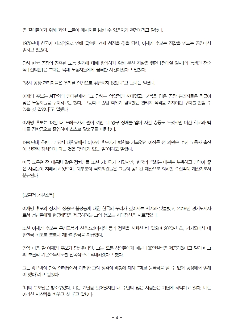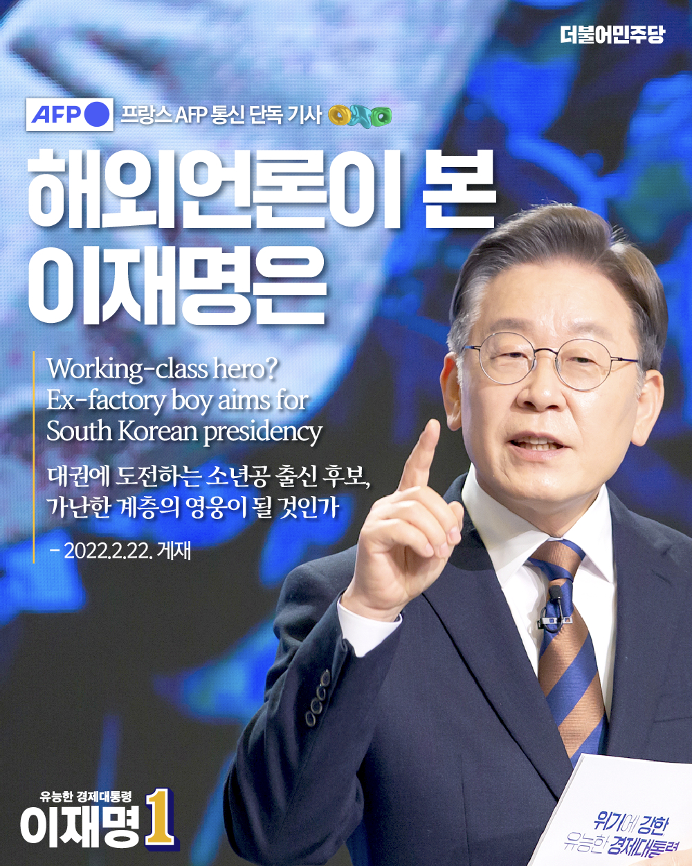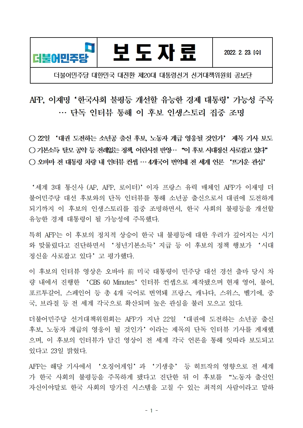 [보도자료] 더불어민주당 선대위 공보단, AFP, 이재명 '한국사회 불평등 개선할 유능한 경제 대통령' 가능성 주목
