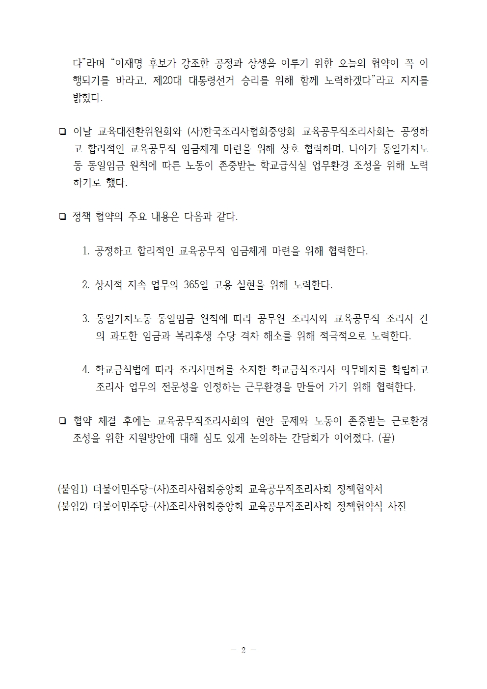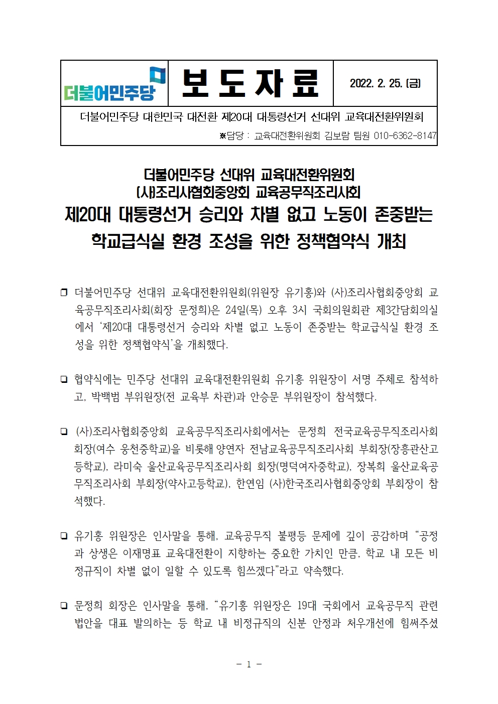 [보도자료] 더불어민주당 선대위 교육대전환위원회, (사)조리사협회중앙회 교육공무직조리사회와 정책협약식 개최