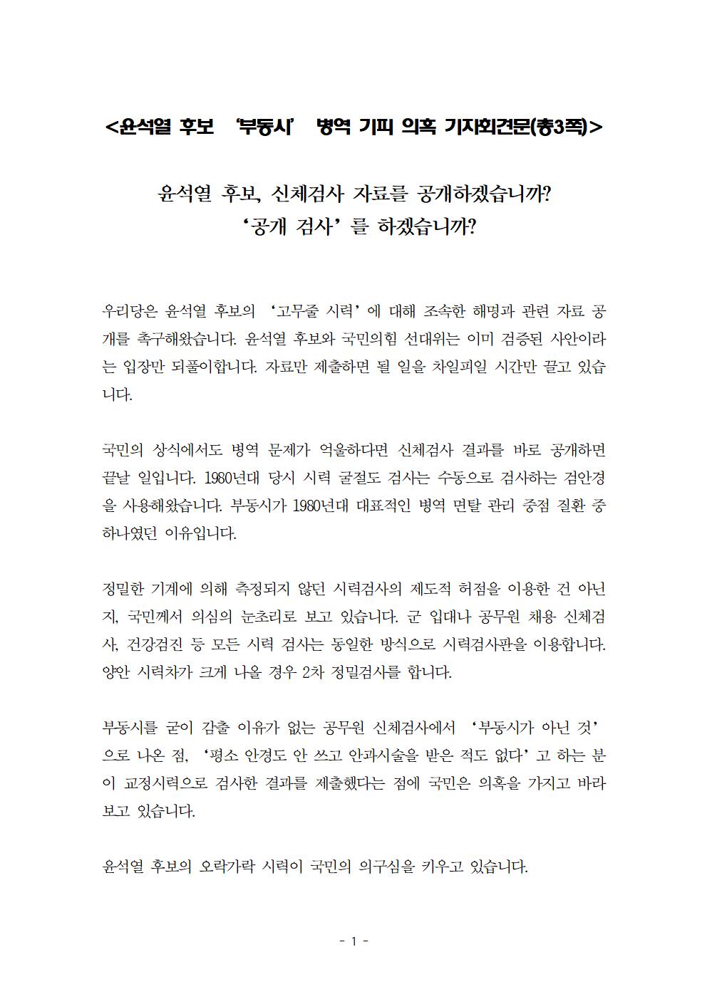 [기자회견문] 더불어민주당 선대위 윤석열 후보 부동시 병역기피 의혹 관련 기자회견