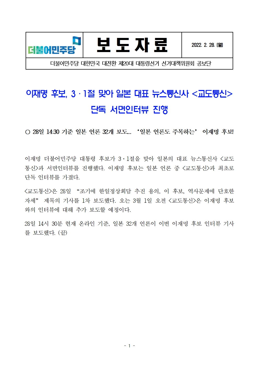 [보도자료] 더불어민주당 선대위 공보단, 이재명 후보, 3·1절 맞아 일본 대표 뉴스통신사 '교도통신' 단독 서면인터뷰 진행