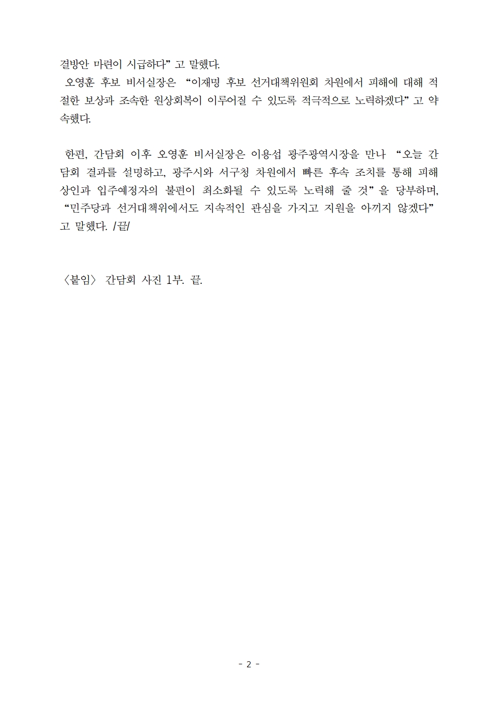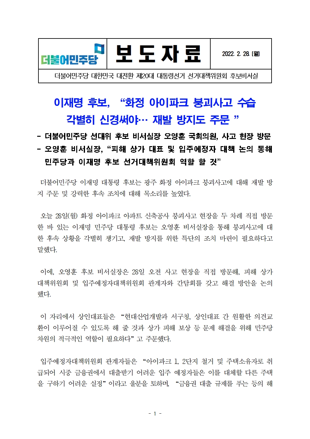 [보도자료] 더불어민주당 선대위 후보비서실, 이재명 후보, “화정 아이파크 붕괴사고 수습 각별히 신경써야… 재발 방지도 주문”
