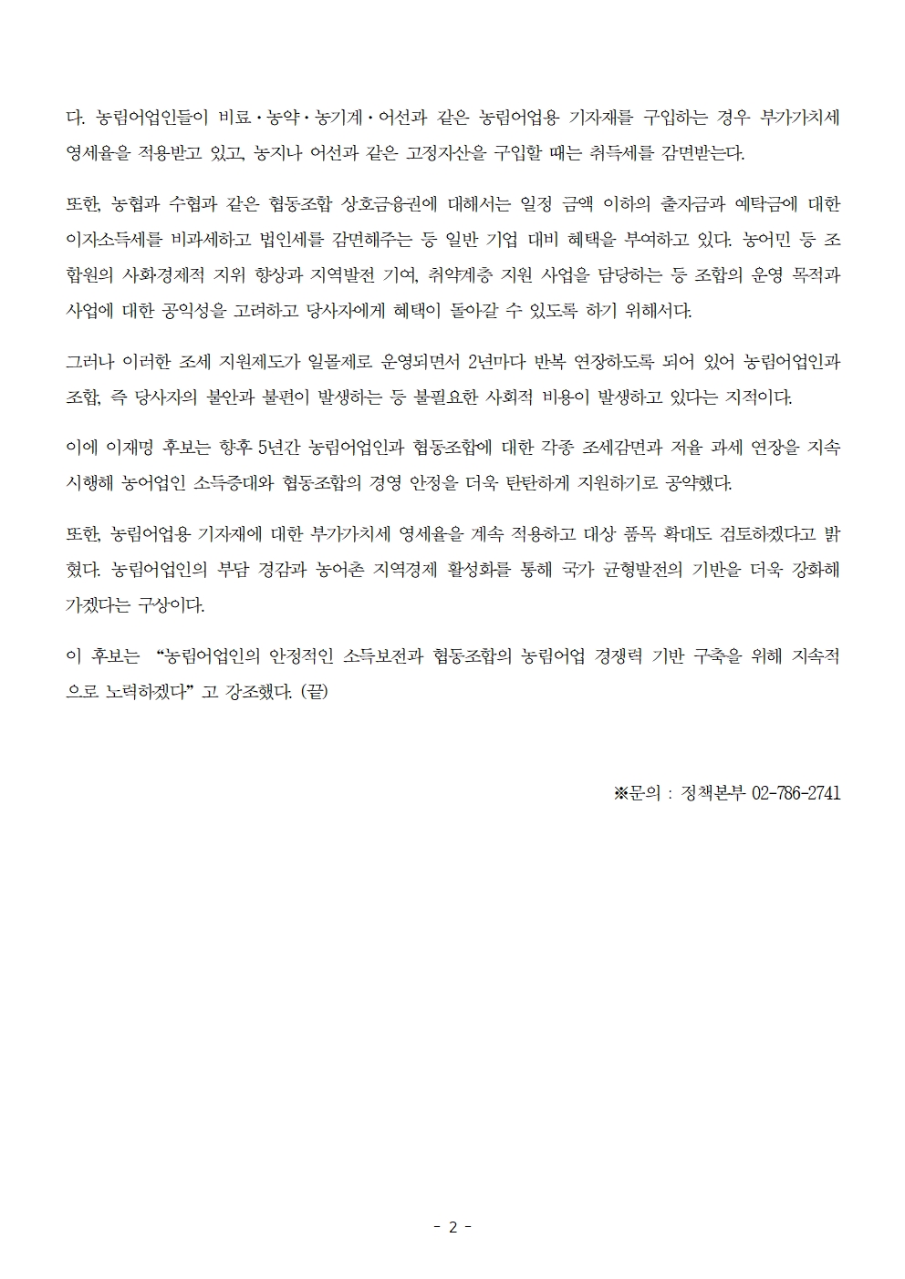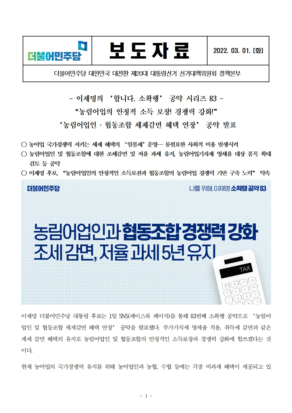 [보도자료] 더불어민주당 선대위 정책본부, '이재명은 합니다. 소확행 공약 시리즈 83' 농림어업인 ‧ 협동조합 세제감면 혜택 연장 공약 발표