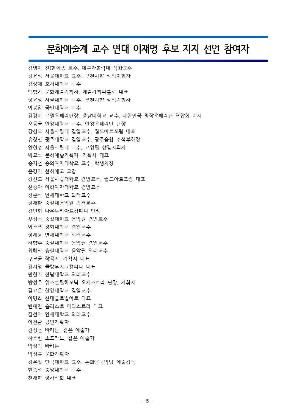 [보도자료] 더불어민주당 선대위 국가비전·국민통합위원회, 문화예술계 교수 및 예술인 연대 80명, 후보 지지선언