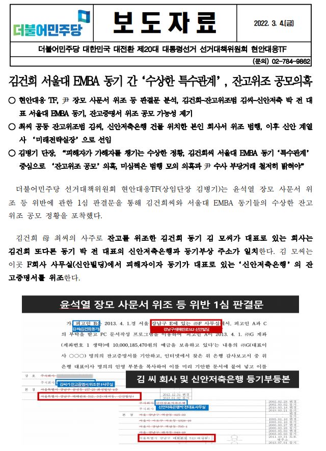 [보도자료] (더불어민주당 선대위 현안대응TF) 김건희 서울대 EMBA 동기 간 ‘수상한 특수관계’, 잔고위조 공모의혹
