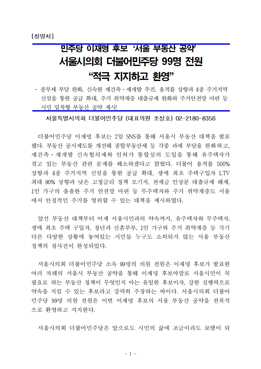 [성명서] 서울시의회 더불어민주당 의원 99명 전원, 후보 ‘서울 부동산 공약’ 적극 지지·환영