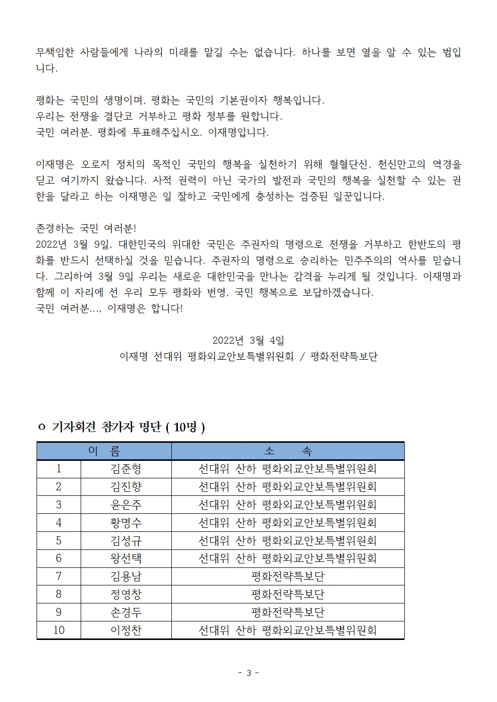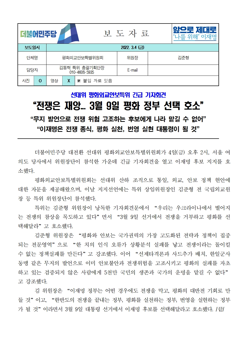 [보도자료] 더불어민주당 선대위 평화외교안보특별위원회, 평화 정부 선택 호소 기자회견