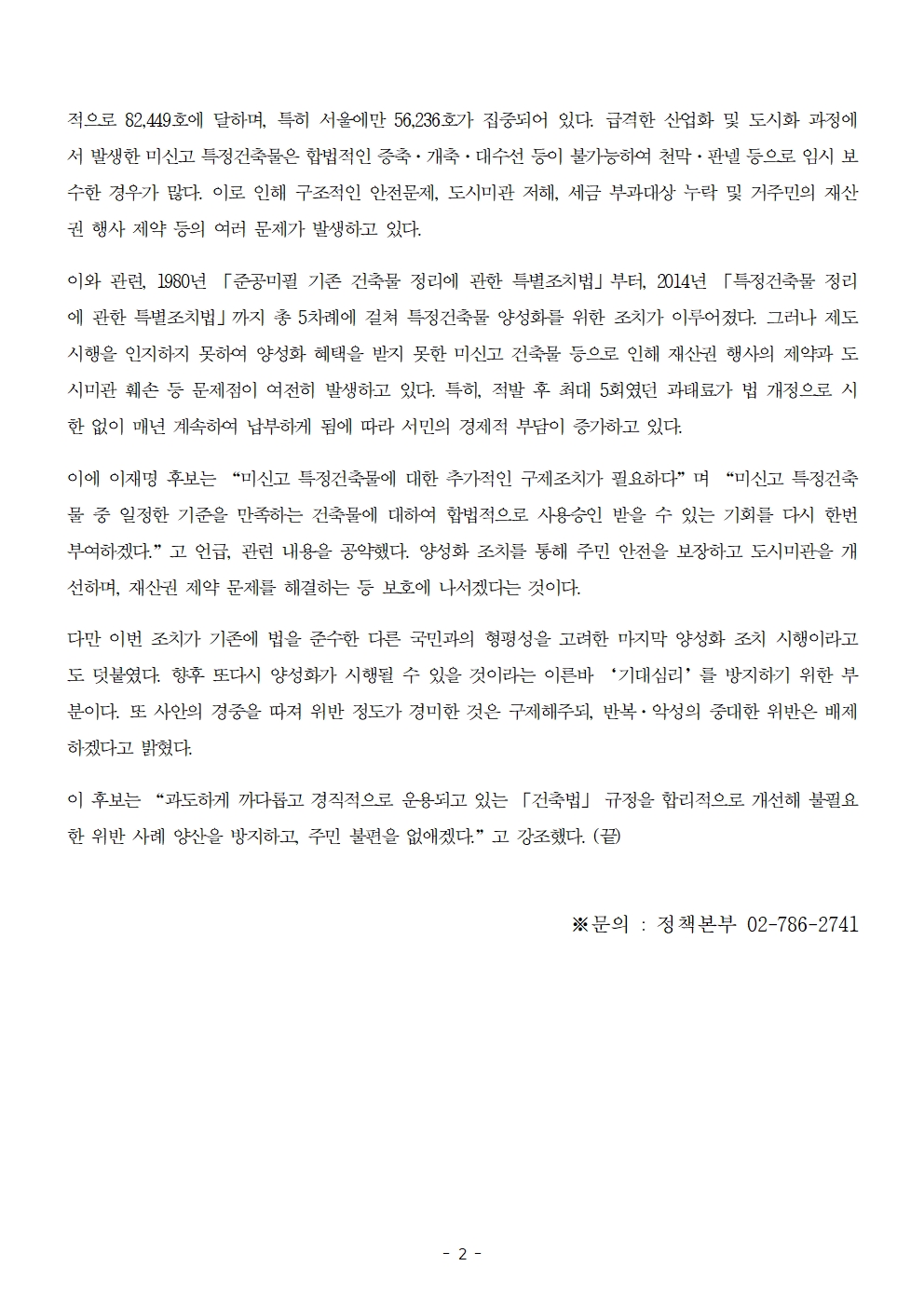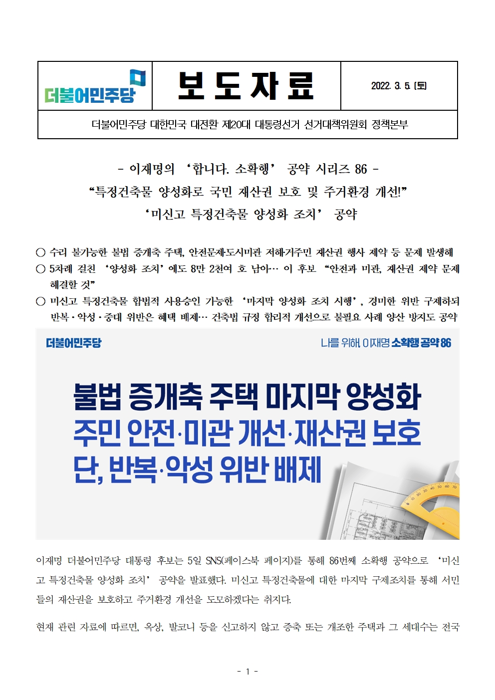 [보도자료] 더불어민주당 선대위 정책본부, '이재명은 합니다. 소확행 공약 시리즈 86' 미신고 특정건축물 양성화 조치 공약 발표