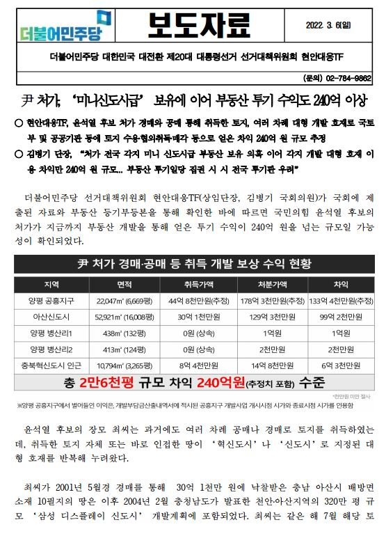 [보도자료] (더불어민주당 선대위 현안대응TF) 尹 처가, ‘미니신도시급’ 보유에 이어 부동산 투기 수익도 240억 이상