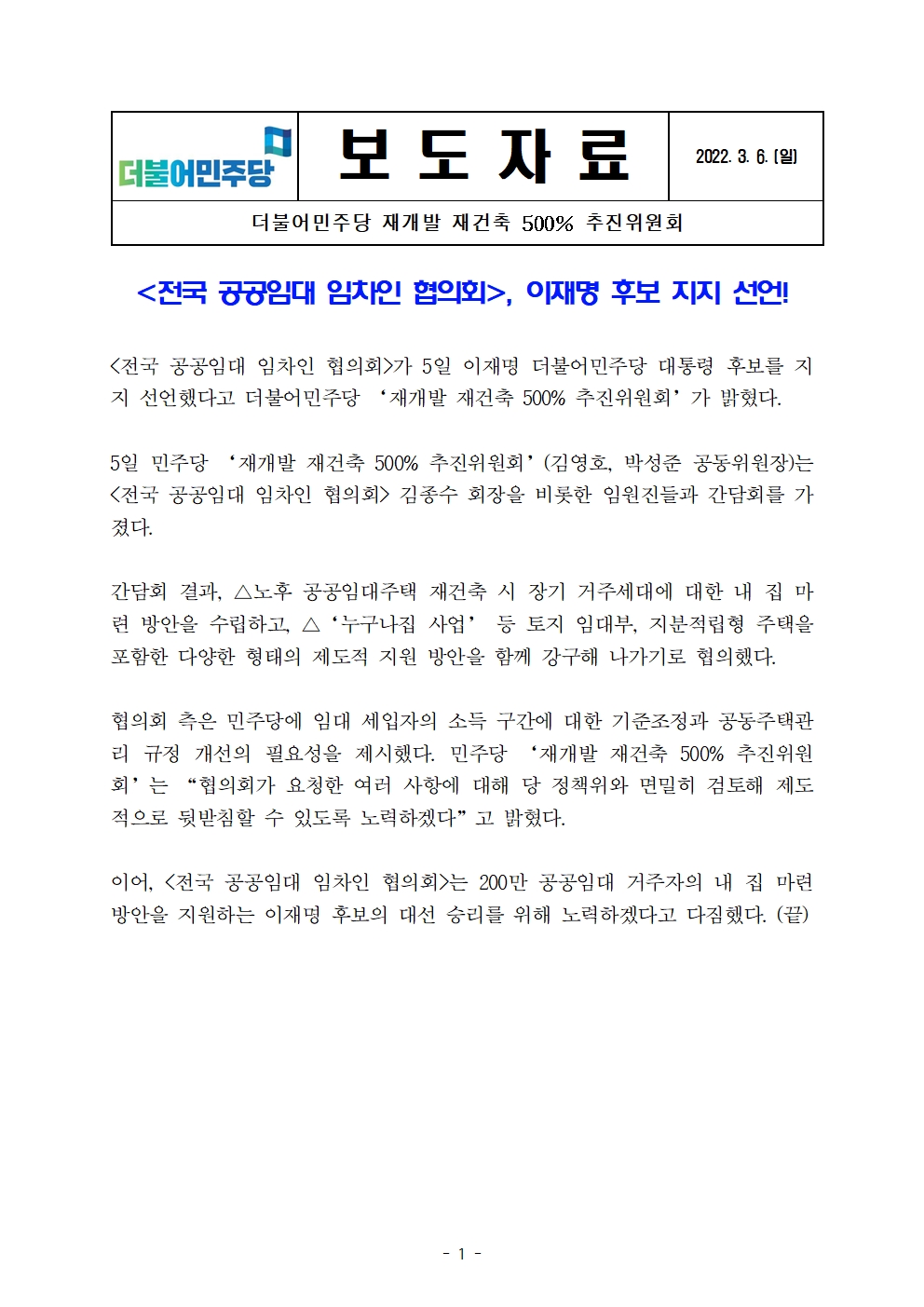 [보도자료] 더불어민주당 재개발 재건축 500% 추진위원회, 전국 공공임대 임차인 협의회 후보 지지선언