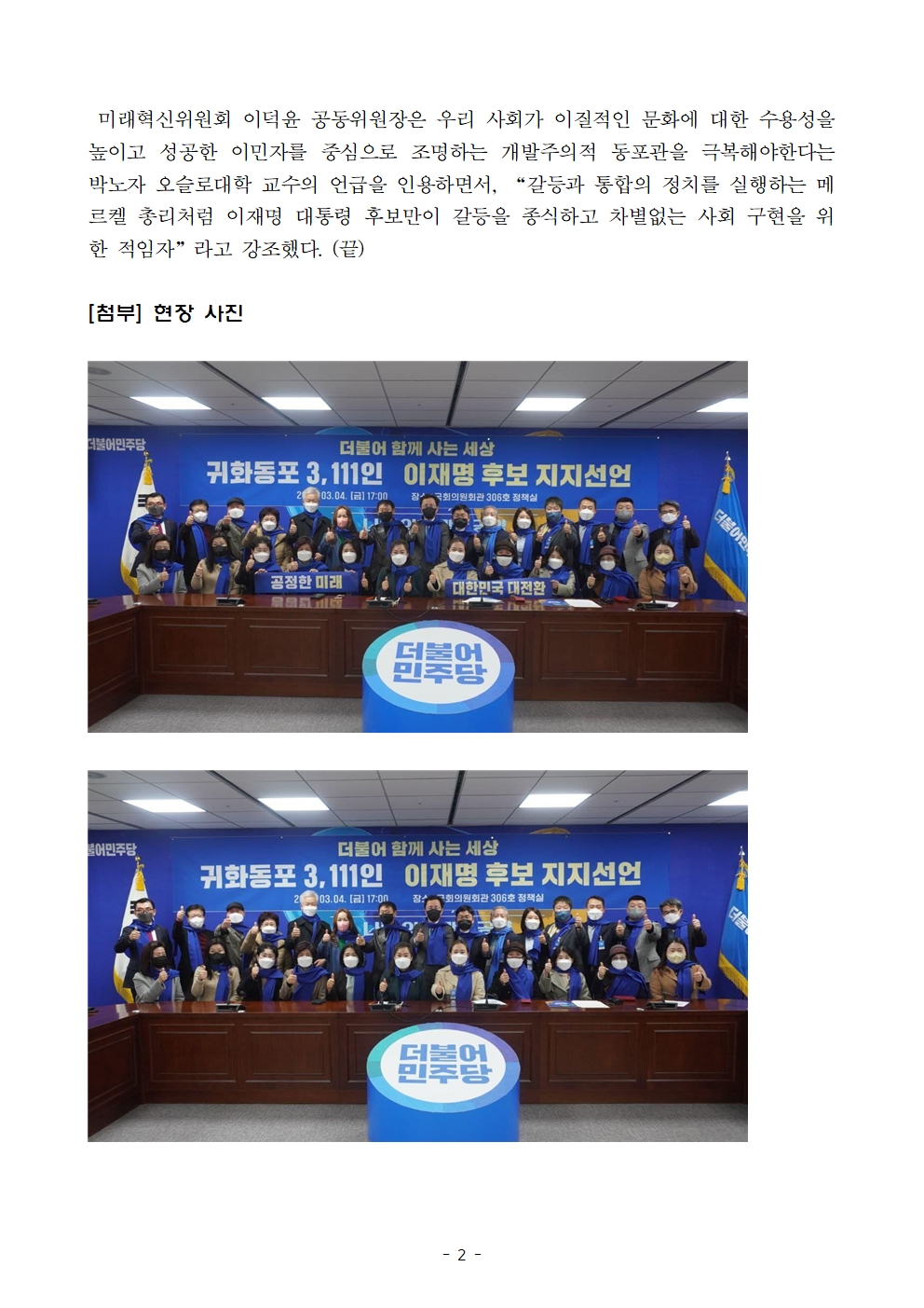 [보도자료] 더불어민주당 선대위 미래혁신위원회, 귀화 동포 3,111명 후보 지지선언