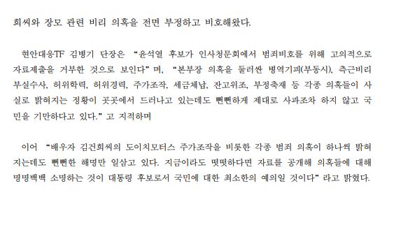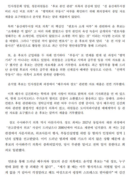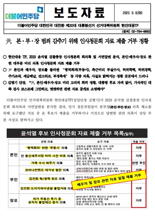 [보도자료] (더불어민주당 선대위 현안대응TF) 尹, 본-부-장 범죄 감추기 위해 인사청문회 자료 제출 거부 정황