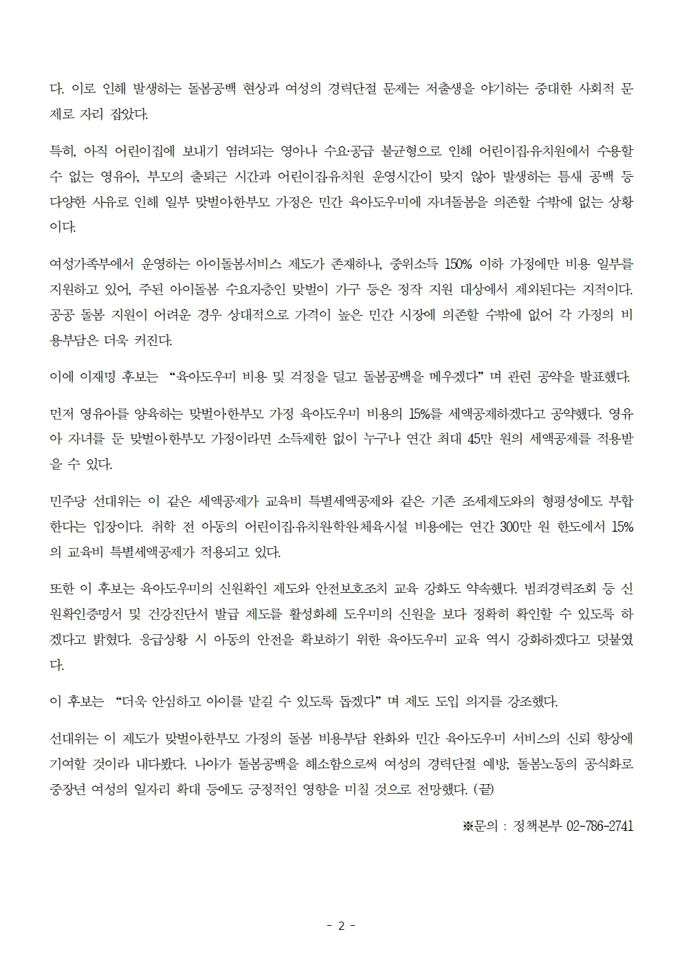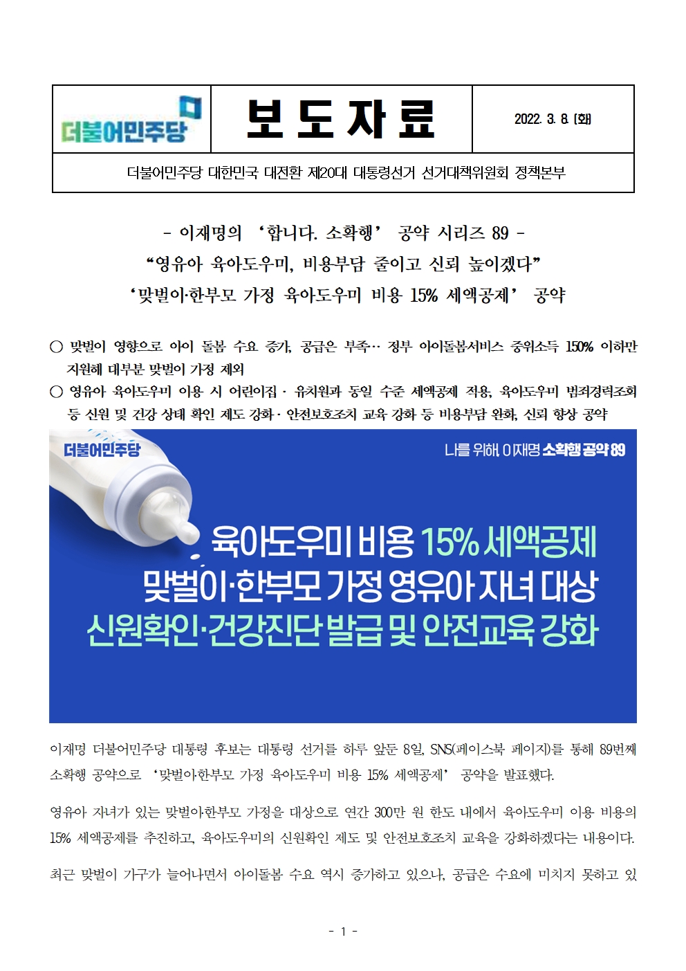 [보도자료] 더불어민주당 선대위 정책본부, '이재명은 합니다. 소확행 공약 시리즈 89' 맞벌이‧한부모 가정 육아도우미 비용 15% 세액공제 공약 발표
