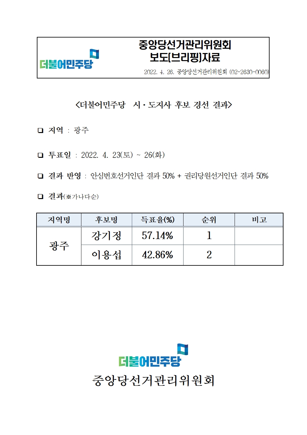[보도자료] 더불어민주당 광주지역 시·도지사 후보 경선 결과
