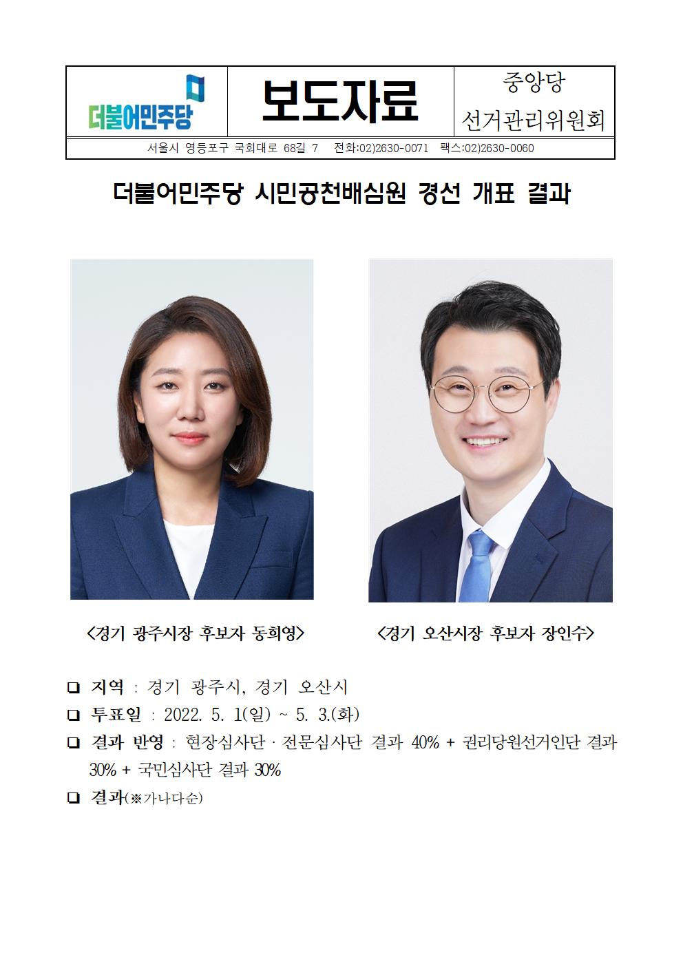 [보도자료] 더불어민주당 시민공천배심원 경선 개표 결과(경기 광주, 오산)