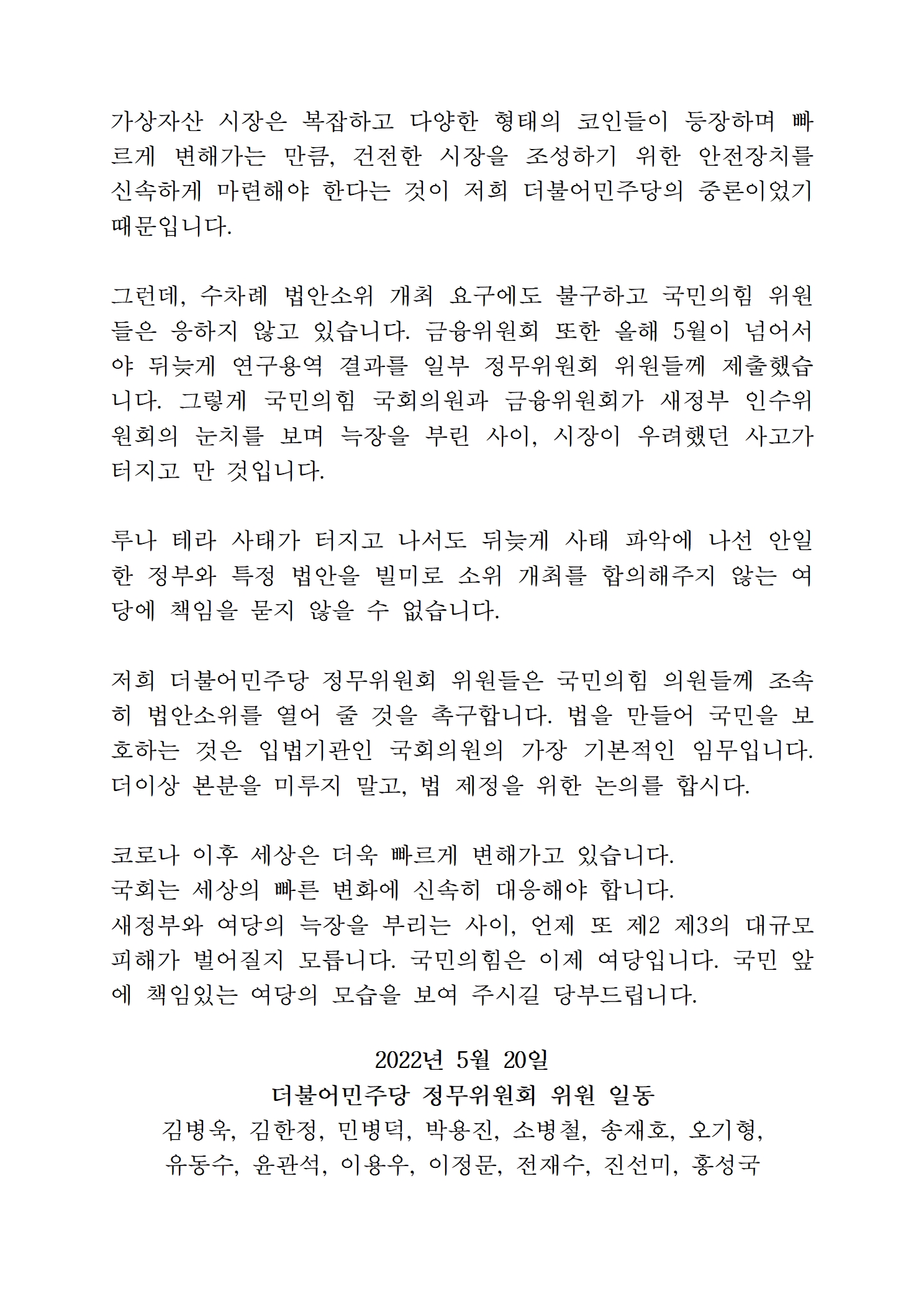 [기자회견문] 더불어민주당 정무위원회 위원, 가상자산업권법 제정 촉구