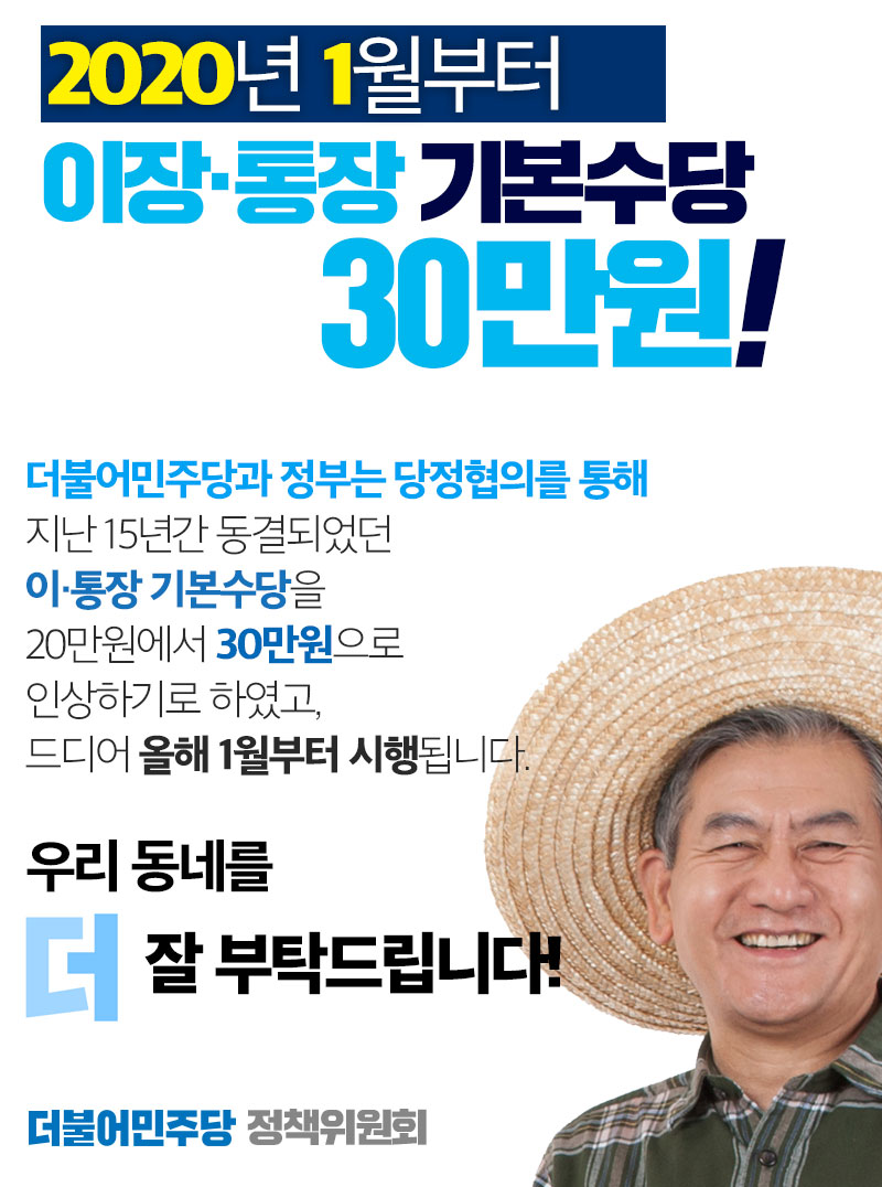 2020년 1월부터 이장·통장 기본수당 30만원!