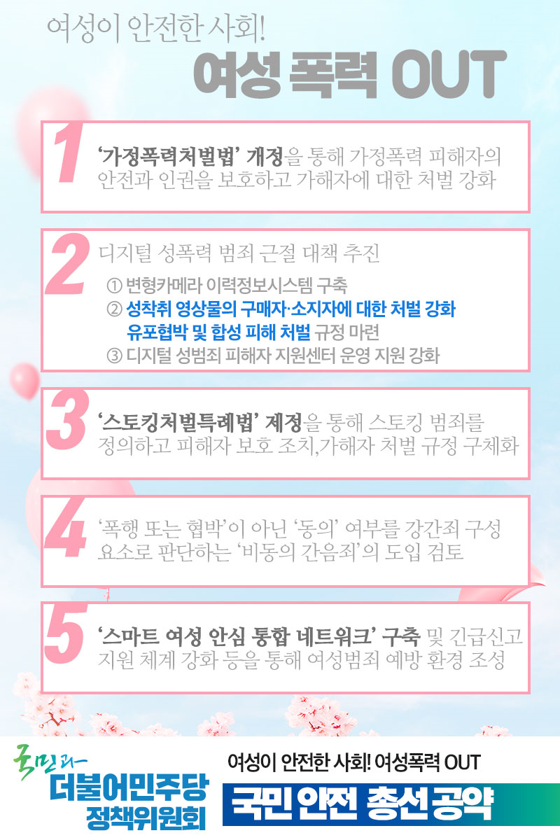 [총선공약] “여성폭력 OUT! 여성이 안전한 사회를 만들겠습니다!” - 국민안전 부문