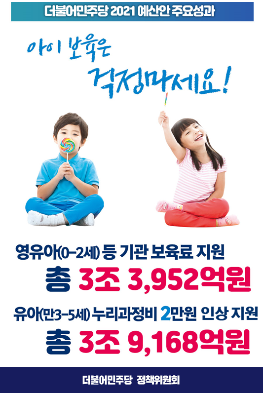 [2021예산성과] 보육예산 영유아기관 보육료 3조 3,952억원, 유아 누리과정비 2만원 인상 지원 3조 9,168억원
