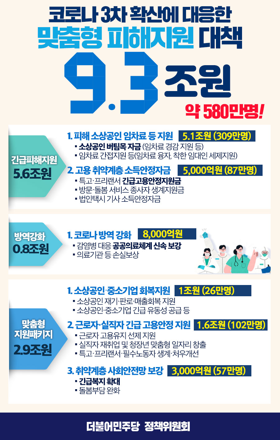 코로나 3차 확산에 대응한 맞춤형 피해지원 대책 9.3조원 (약 580만명)